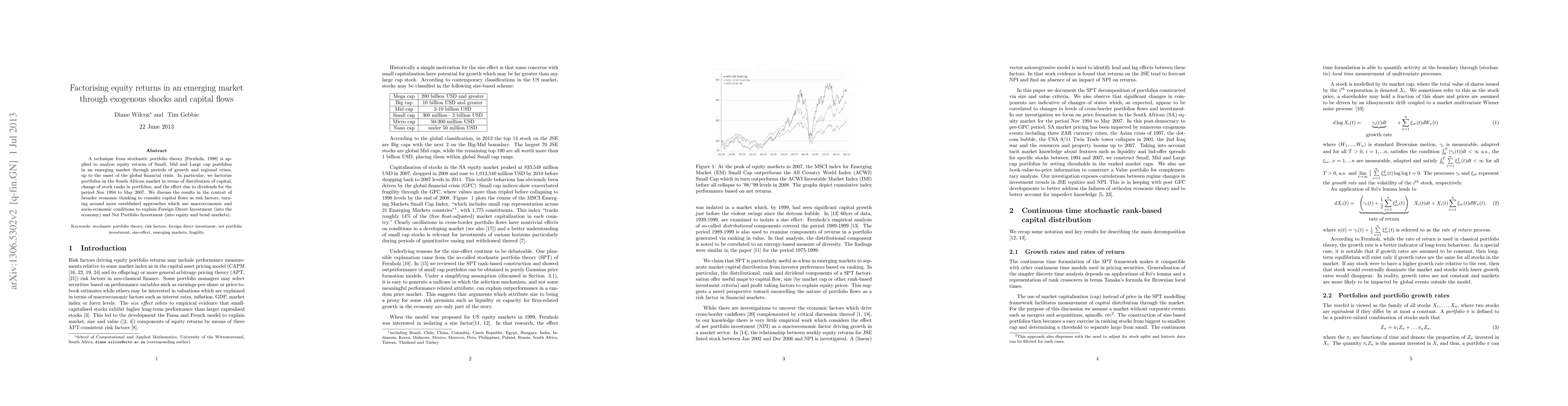 A technique from stochastic portfolio theory [Fernholz, 1998] is applied to analyse equity returns of Small, Mid and Large cap portfolios in an emerging market through periods of growth and regional crises, up to the onset of the global financial crisis. In particular, we factorize portfolios in the South African market in terms of distribution of capital, change of stock ranks in portfolios, and the effect due to dividends for the period Nov 1994 to May 2007. We discuss the results in the context of broader economic thinking to consider capital flows as risk factors, turning around more established approaches which use macroeconomic and socio-economic conditions to explain Foreign Direct Investment (into the economy) and Net Portfolio Investment (into equity and bond markets).