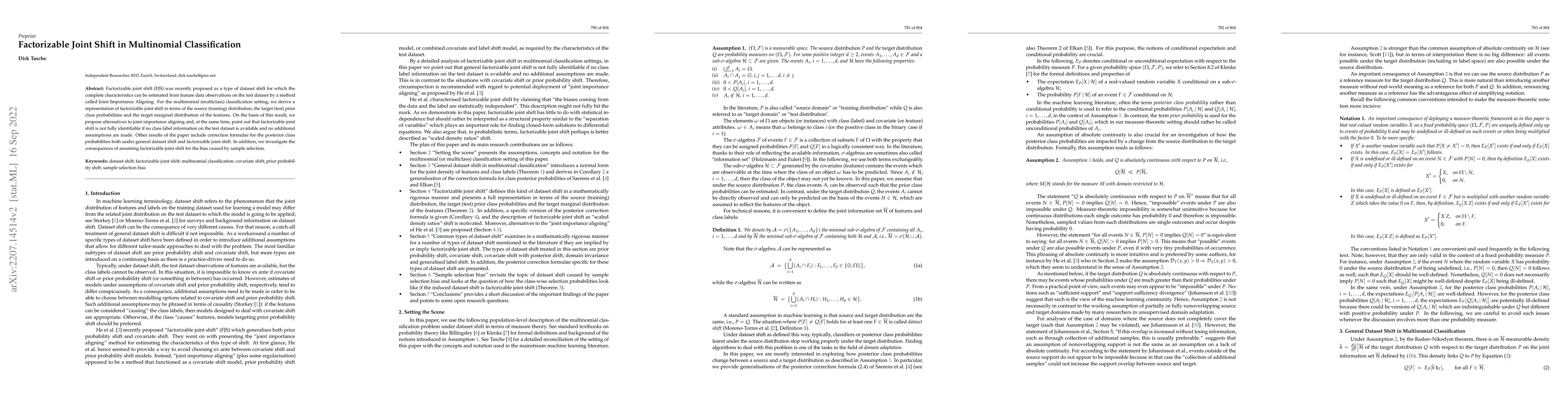 This paper introduces the concept of factorizable joint shift (FJS) in multinomial classification, deriving its representation in terms of source and target distributions. It proposes alternatives to joint importance aligning and discusses the limitations of FJS without class label information, also presenting correction formulae for posterior class probabilities under dataset shift.