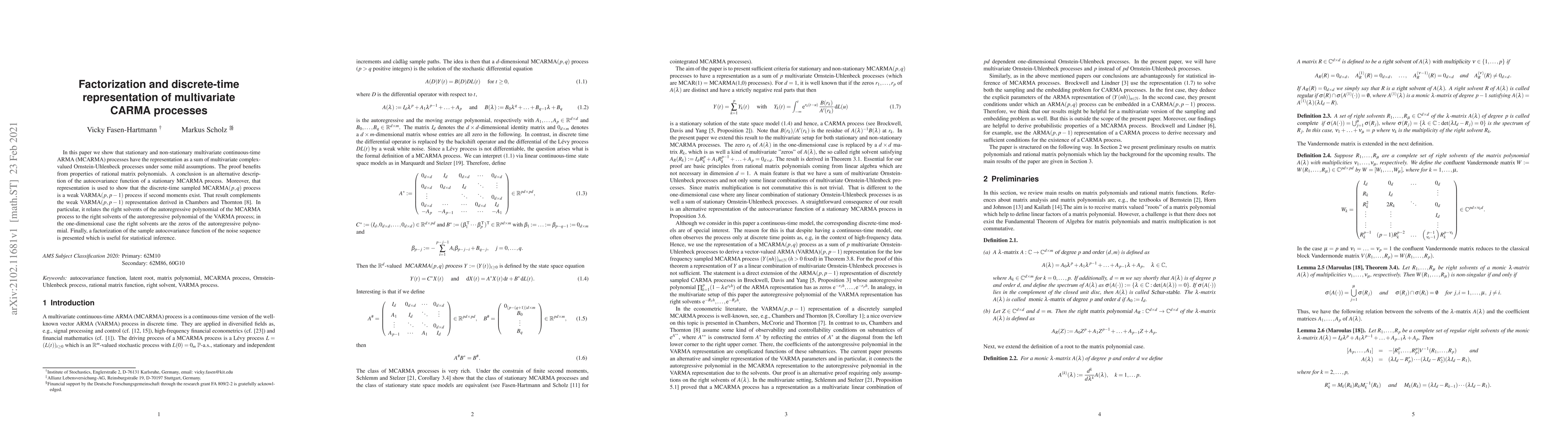This paper demonstrates the factorization and discrete-time representation of multivariate CARMA processes, showing they can be expressed as sums of complex-valued Ornstein-Uhlenbeck processes. It also reveals that sampled MCARMA processes correspond to weak VARMA processes, enhancing statistical inference through a novel factorization of the sample autocovariance function.