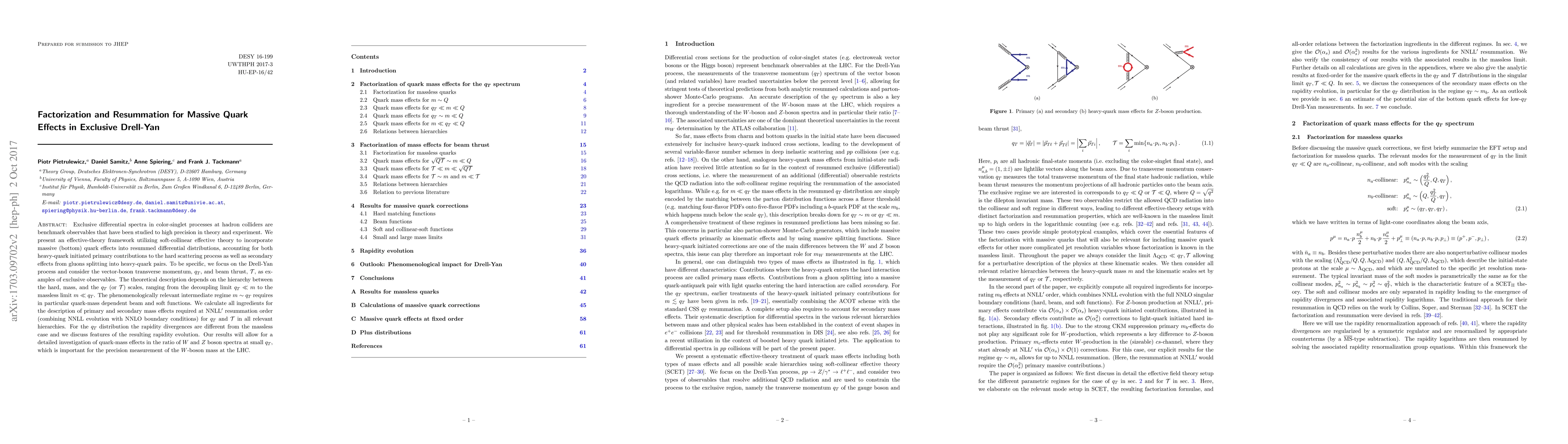 Exclusive differential spectra in color-singlet processes at hadron colliders are benchmark observables that have been studied to high precision in theory and experiment. We present an effective-theory framework utilizing soft-collinear effective theory to incorporate massive (bottom) quark effects into resummed differential distributions, accounting for both heavy-quark initiated primary contributions to the hard scattering process as well as secondary effects from gluons splitting into heavy-quark pairs. To be specific, we focus on the Drell-Yan process and consider the vector-boson transverse momentum, $q_T$, and beam thrust, $\mathcal T$, as examples of exclusive observables. The theoretical description depends on the hierarchy between the hard, mass, and the $q_T$ (or $\mathcal T$) scales, ranging from the decoupling limit $q_T \ll m$ to the massless limit $m \ll q_T$. The phenomenologically relevant intermediate regime $m \sim q_T$ requires in particular quark-mass dependent beam and soft functions. We calculate all ingredients for the description of primary and secondary mass effects required at NNLL$'$ resummation order (combining NNLL evolution with NNLO boundary conditions) for $q_T$ and $\mathcal T$ in all relevant hierarchies. For the $q_T$ distribution the rapidity divergences are different from the massless case and we discuss features of the resulting rapidity evolution. Our results will allow for a detailed investigation of quark-mass effects in the ratio of $W$ and $Z$ boson spectra at small $q_T$, which is important for the precision measurement of the $W$-boson mass at the LHC.