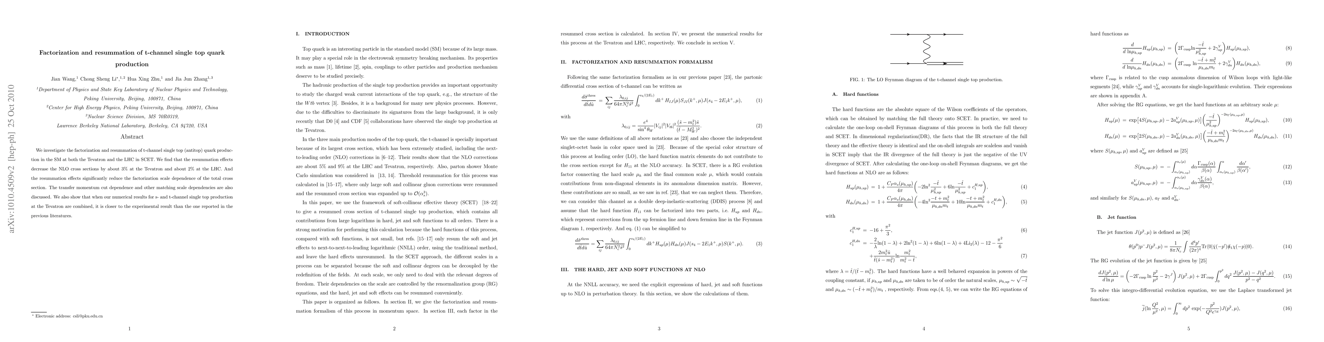 This paper studies the factorization and resummation of t-channel single top (antitop) quark production in the Standard Model at the Tevatron and LHC using SCET. The resummation reduces NLO cross sections by 3% at the Tevatron and 2% at the LHC, significantly decreasing the scale dependence, and improves agreement with experimental results at the Tevatron.