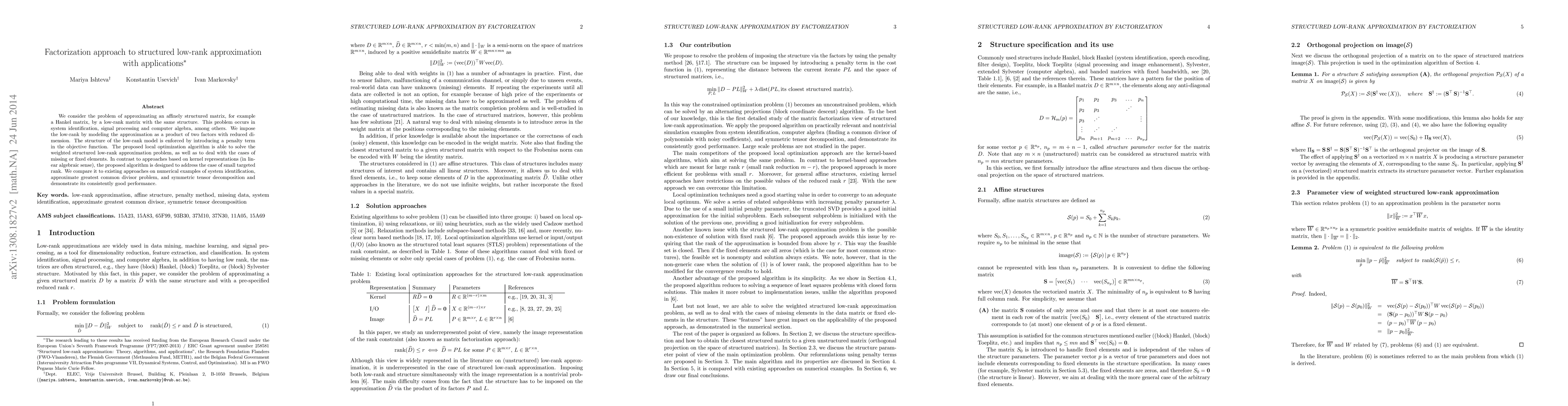 This paper proposes a factorization approach for approximating affinely structured matrices, such as Hankel matrices, by low-rank matrices with the same structure, using a product of two factors. The method enforces structure through a penalty term and outperforms existing kernel-based approaches, especially for small targeted ranks, as demonstrated in applications like system identification and tensor decomposition.