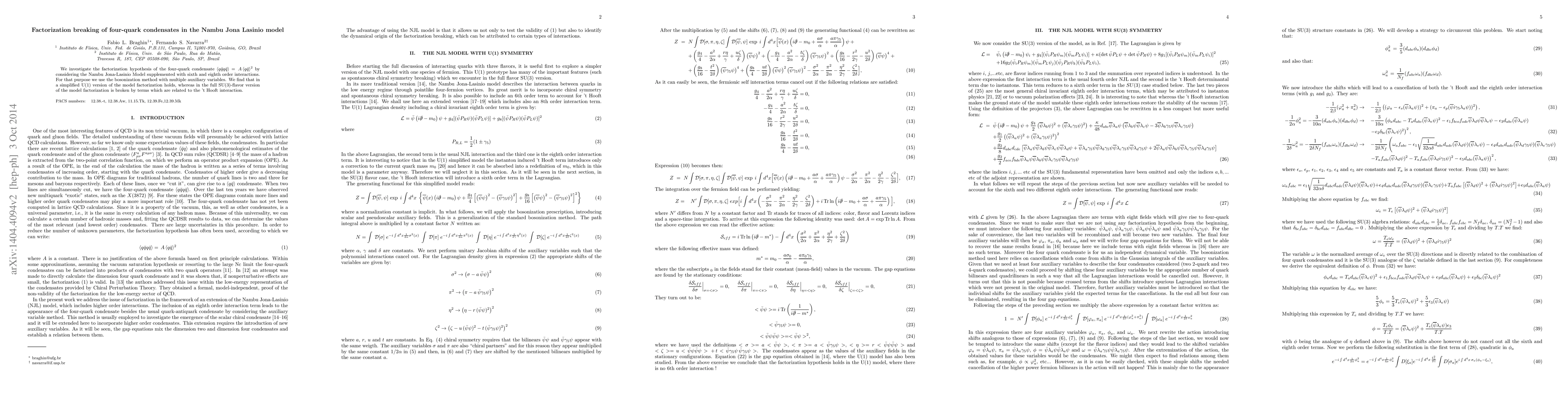 This paper examines the factorization hypothesis of four-quark condensates in the Nambu Jona-Lasinio model, finding that factorization holds in a simplified U(1) version but is broken in the full SU(3)-flavor version due to 't Hooft interactions. The study employs bosonization with multiple auxiliary variables.