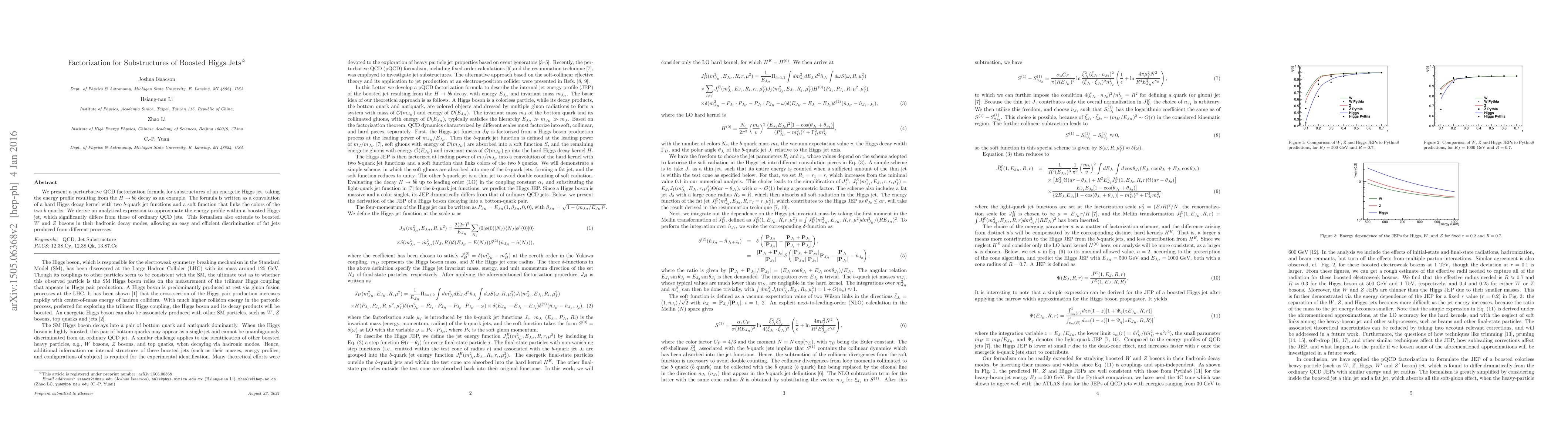 We present a perturbative QCD factorization formula for substructures of an energetic Higgs jet, taking the energy profile resulting from the $H\to b\bar b$ decay as an example. The formula is written as a convolution of a hard Higgs decay kernel with two $b$-quark jet functions and a soft function that links the colors of the two $b$ quarks. We derive an analytical expression to approximate the energy profile within a boosted Higgs jet, which significantly differs from those of ordinary QCD jets. This formalism also extends to boosted $W$ and $Z$ bosons in their hadronic decay modes, allowing an easy and efficient discrimination of fat jets produced from different processes.