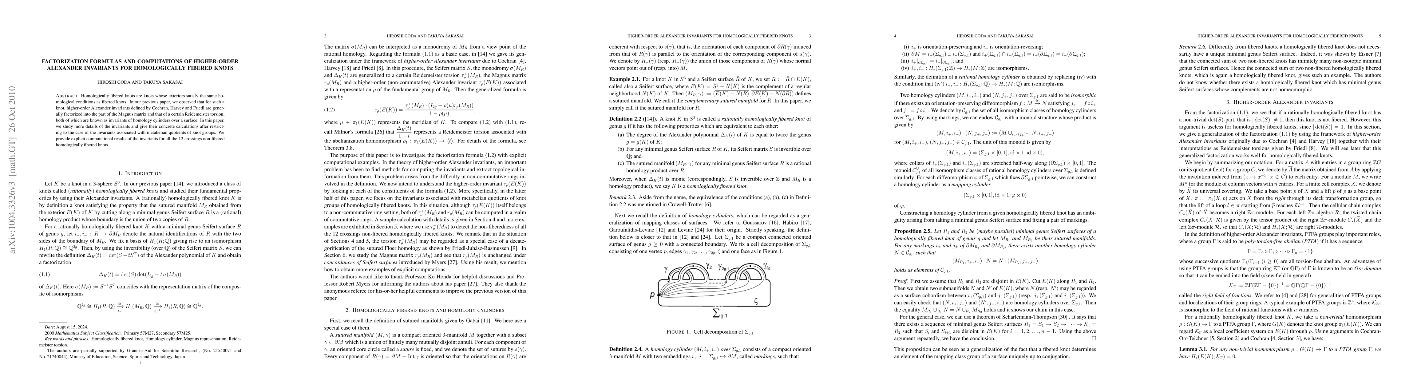 This paper investigates factorization formulas for higher-order Alexander invariants of homologically fibered knots, showing they decompose into parts from the Magnus matrix and Reidemeister torsion. It provides detailed calculations for metabelian quotients of knot groups and exemplifies computations for 12 specific non-fibered homologically fibered knots.