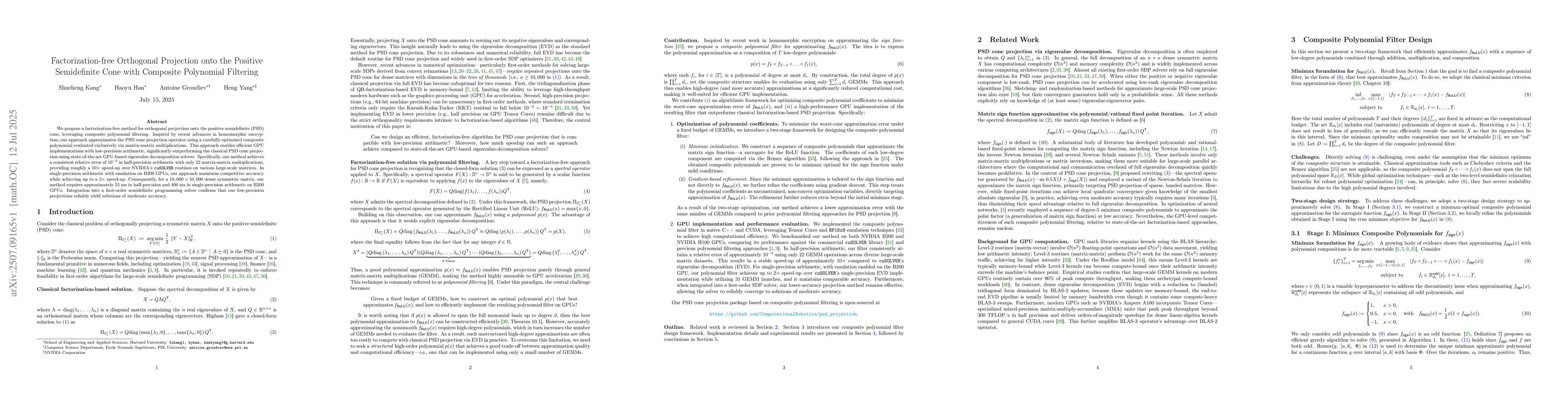 We propose a factorization-free method for orthogonal projection onto the positive semidefinite (PSD) cone, leveraging composite polynomial filtering. Inspired by recent advances in homomorphic encryption, our approach approximates the PSD cone projection operator using a carefully optimized composite polynomial evaluated exclusively via matrix-matrix multiplications. This approach enables efficient GPU implementations with low-precision arithmetic, significantly outperforming the classical PSD cone projection using state-of-the-art GPU-based eigenvalue decomposition solvers. Specifically, our method achieves a consistent relative error of $10^{-3}$ in half-precision arithmetic with only 22 matrix-matrix multiplications, providing roughly a $10\times$ speed-up over NVIDIA's cuSOLVER routines on various large-scale matrices. In single-precision arithmetic with emulation on B200 GPUs, our approach maintains competitive accuracy while achieving up to a $2\times$ speed-up. Consequently, for a $10,000 \times 10,000$ dense symmetric matrix, our method requires approximately $55$ ms in half-precision and $400$ ms in single-precision arithmetic on B200 GPUs. Integration into a first-order semidefinite programming solver confirms that our low-precision projections reliably yield solutions of moderate accuracy.