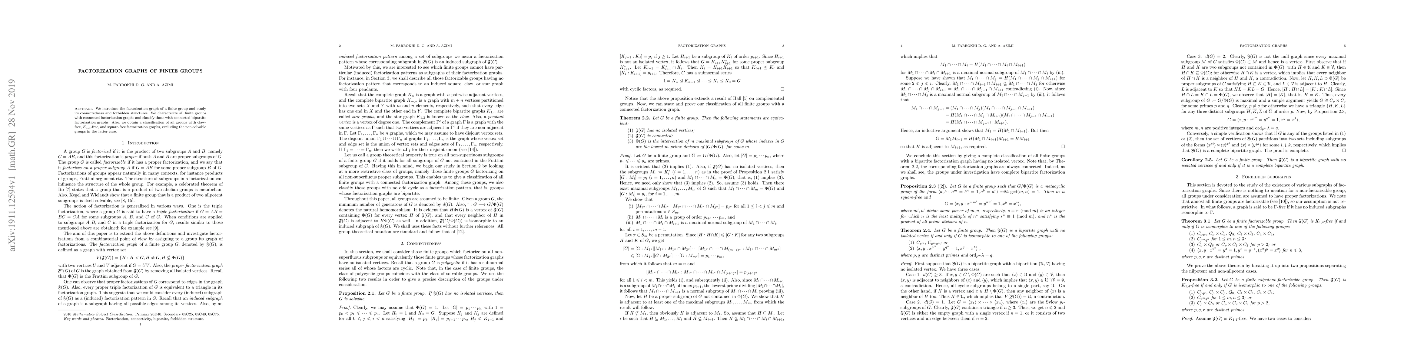 This paper introduces factorization graphs for finite groups, investigates their connectedness, and identifies forbidden structures. It classifies groups with connected factorization graphs and bipartite factorization graphs, and provides a classification for groups with claw-free, $K_{1,4}$-free, and square-free factorization graphs, excluding non-solvable groups for the latter.