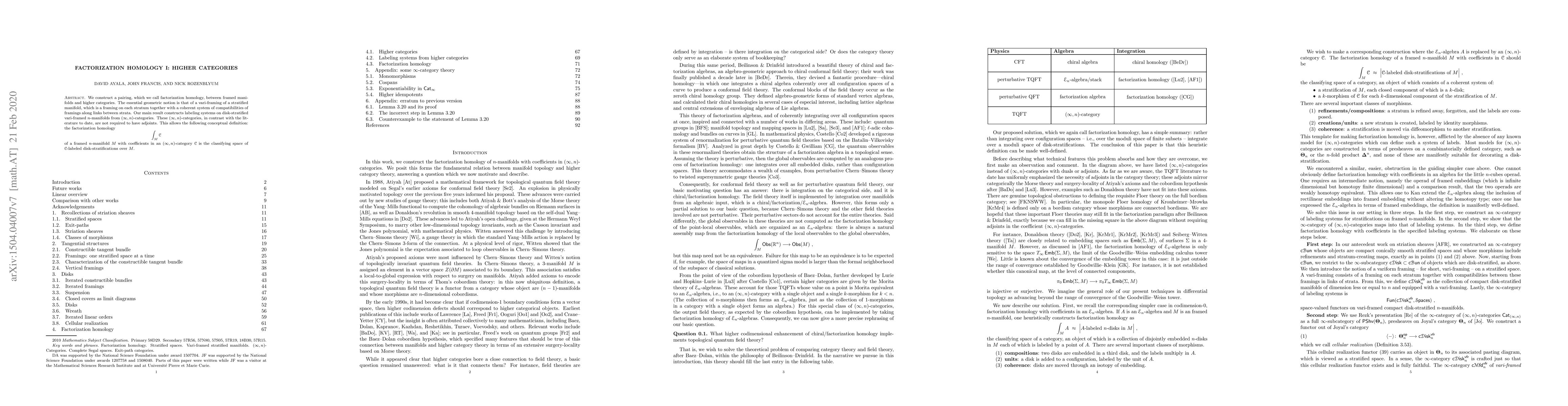 The paper introduces factorization homology, a pairing between framed manifolds and higher categories, using vari-framings to construct $(\infty,n)$-category labeling systems on disk-stratified manifolds. The key result defines factorization homology as the classifying space of $\mathcal{C}$-labeled disk-stratifications over $M$, without requiring $\mathcal{C}$ to have adjoints.