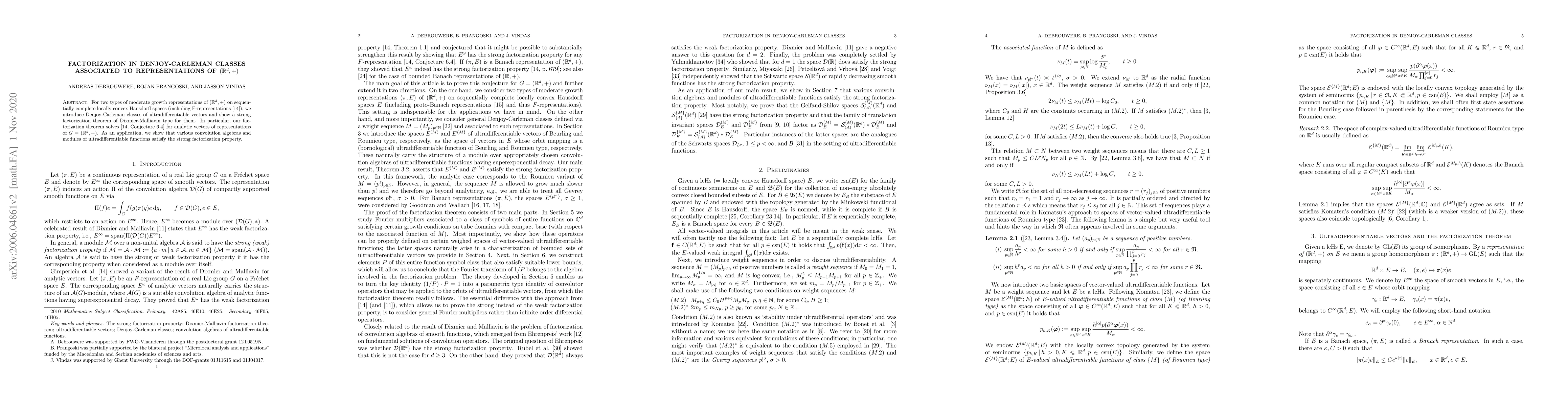 Researchers introduce Denjoy-Carleman classes of ultradifferentiable vectors and prove a strong factorization theorem for them, solving a conjecture related to analytic vectors in representations of the additive group.