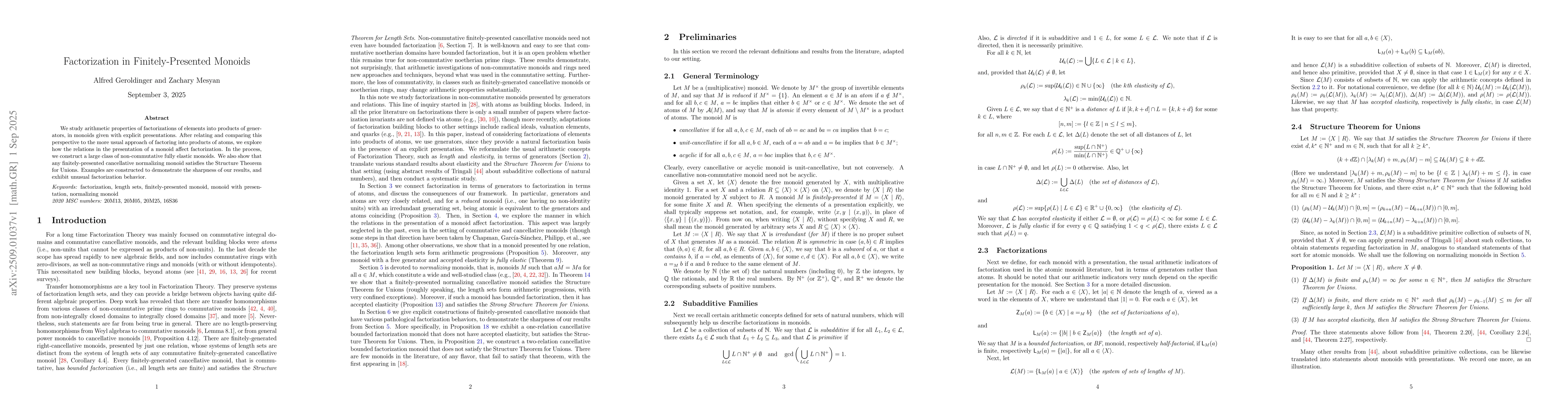 We study arithmetic properties of factorizations of elements into products of generators, in monoids given with explicit presentations. After relating and comparing this perspective to the more usual approach of factoring into products of atoms, we explore how the relations in the presentation of a monoid affect factorization. In the process, we construct a large class of non-commutative fully elastic monoids. We also show that any finitely-presented cancellative normalizing monoid satisfies the Structure Theorem for Unions. Examples are constructed to demonstrate the sharpness of our results, and exhibit unusual factorization behavior.