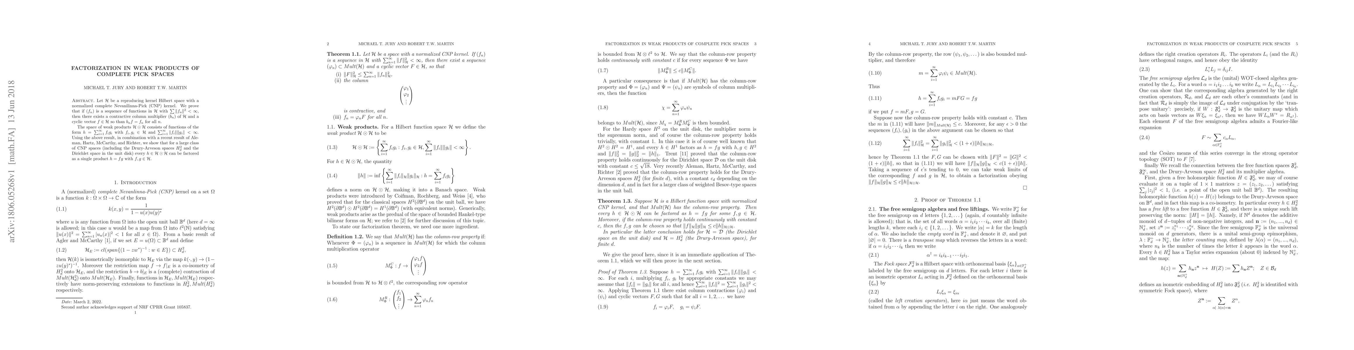 Let $\mathcal H$ be a reproducing kernel Hilbert space with a normalized complete Nevanlinna-Pick (CNP) kernel. We prove that if $(f_n)$ is a sequence of functions in $\mathcal H$ with $\sum\|f_n\|^2<\infty$, then there exists a contractive column multiplier $(\varphi_n)$ of $\mathcal H$ and a cyclic vector $F\in \mathcal H$ so that $\varphi_ n F=f_n$ for all $n$. The space of weak products $\mathcal H\odot\mathcal H$ is the set of functions of the form $h=\sum_{i=1}^\infty f_ig_i$ with $f_i, g_i\in\mathcal H$ and $\sum_{i=1}^\infty \|f_i\|\|g_i\|<\infty$. Using the above result, in combination with a recent result of Aleman, Hartz, McCarthy, and Richter, we show that for a large class of CNP spaces (including the Drury-Arveson spaces $H^2_d$ and the Dirichlet space in the unit disk) every $h\in\mathcal H\odot\mathcal H$ can be factored as a single product $h=fg$ with $f,g\in\mathcal H$.