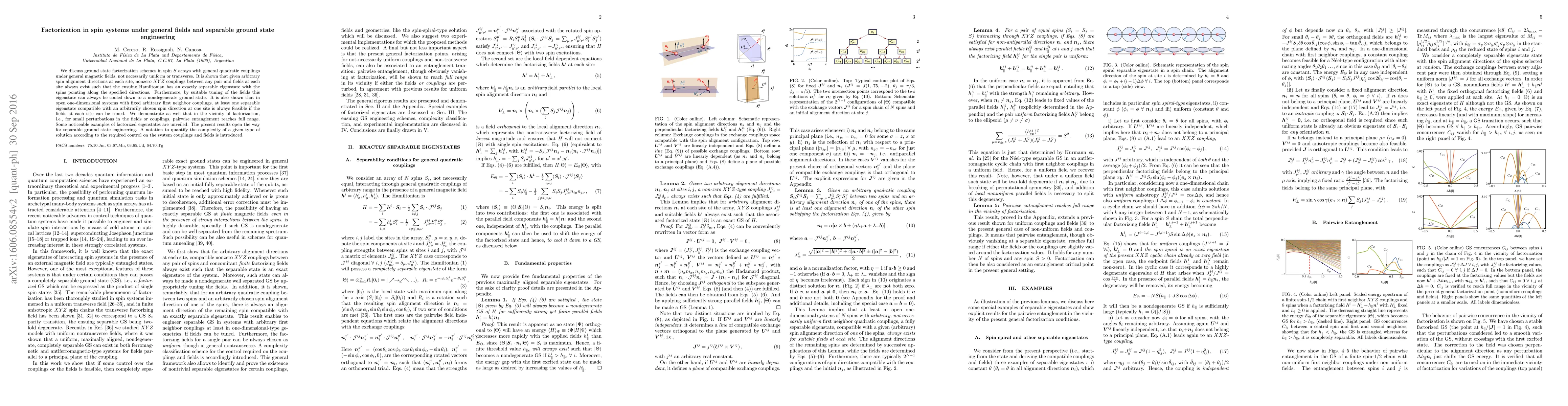 We discuss ground state factorization schemes in spin $S$ arrays with general $XYZ$ couplings under general magnetic fields, not necessarily uniform or transverse. It is first shown that given arbitrary spin alignment directions at each site, nonzero couplings between any pair and fields at each site always exist such that the ensuing Hamiltonian has an exactly separable eigenstate with the spins pointing along the specified directions. Furthermore, by suitable tuning of the fields this eigenstate can always be cooled down to a nondegenerate ground state. It is also shown that in open one-dimensional systems with arbitrary $XYZ$ first neighbor couplings, at least one separable eigenstate compatible with an arbitrarily chosen spin direction at one site is always feasible if the fields at each site can be tuned. We demonstrate as well that in the vicinity of factorization, i.e., for small perturbations in the fields or couplings, pairwise entanglement reaches full range. Some noticeable examples of factorized eigenstates for uniform couplings are unveiled. The present results open the way for separable ground state engineering. A notation to quantify the complexity of a given type of solution according to the required control on the system couplings and fields is introduced.