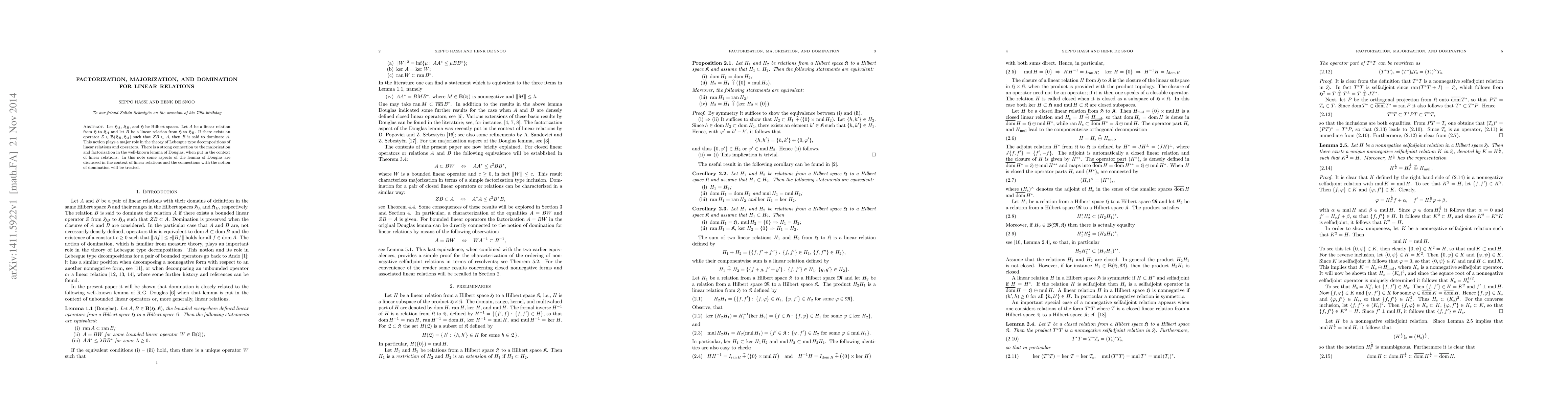 Let ${\mathfrak H}_A$, ${\mathfrak H}_B$, and ${\mathfrak H}$ be Hilbert spaces. Let $A$ be a linear relation from ${\mathfrak H}$ to ${\mathfrak H}_A$ and let $B$ be a linear relation from ${\mathfrak H}$ to ${\mathfrak H}_B$. If there exists an operator $Z \in \mathbf{B}({\mathfrak H}_B,{\mathfrak H}_A)$ such that $ZB \subset A$, then $B$ is said to dominate $A$. This notion plays a major role in the theory of Lebesgue type decompositions of linear relations and operators. There is a strong connection to the majorization and factorization in the well-known lemma of Douglas, when put in the context of linear relations. In this note some aspects of the lemma of Douglas are discussed in the context of linear relations and the connections with the notion of domination will be treated.