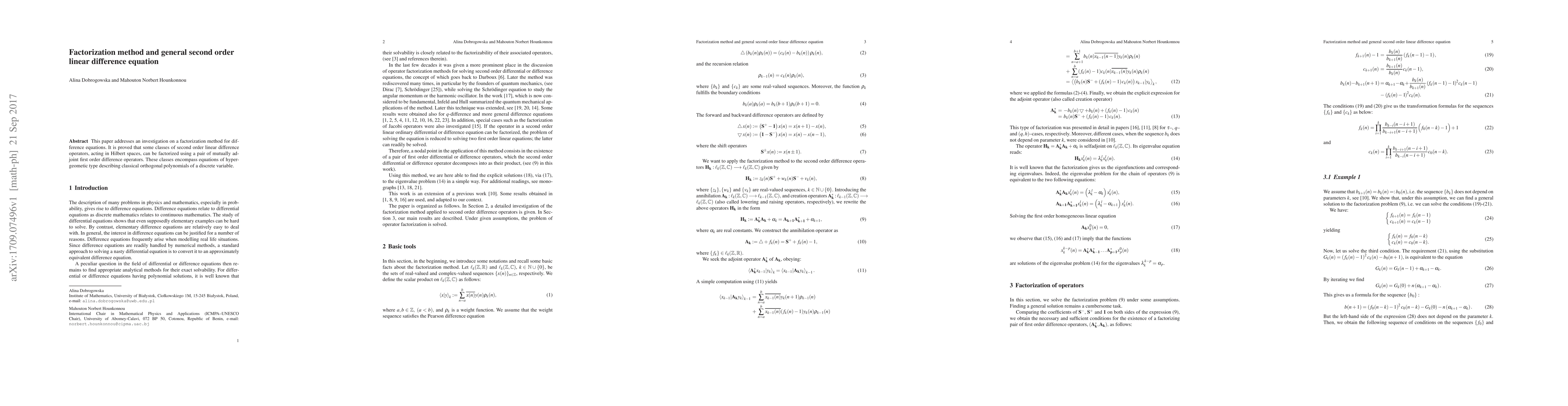 This paper addresses an investigation on a factorization method for difference equations. It is proved that some classes of second order linear difference operators, acting in Hilbert spaces, can be factorized using a pair of mutually adjoint first order difference operators. These classes encompass equations of hypergeometic type describing classical orthogonal polynomials of a discrete variable.