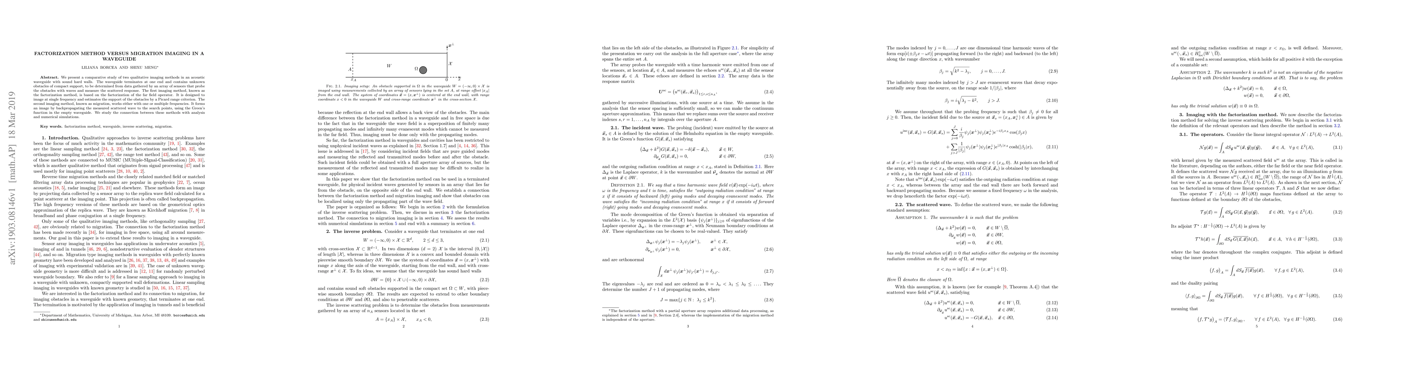 We present a comparative study of two qualitative imaging methods in an acoustic waveguide with sound hard walls. The waveguide terminates at one end and contains unknown obstacles of compact support, to be determined from data gathered by an array of sensors that probe the obstacles with waves and measure the scattered response. The first imaging method, known as the factorization method, is based on the factorization of the far field operator. It is designed to image at single frequency and estimates the support of the obstacles by a Picard range criterion. The second imaging method, known as migration, works either with one or multiple frequencies. It forms an image by backpropagating the measured scattered wave to the search points, using the Green's function in the empty waveguide. We study the connection between these methods with analysis and numerical simulations.