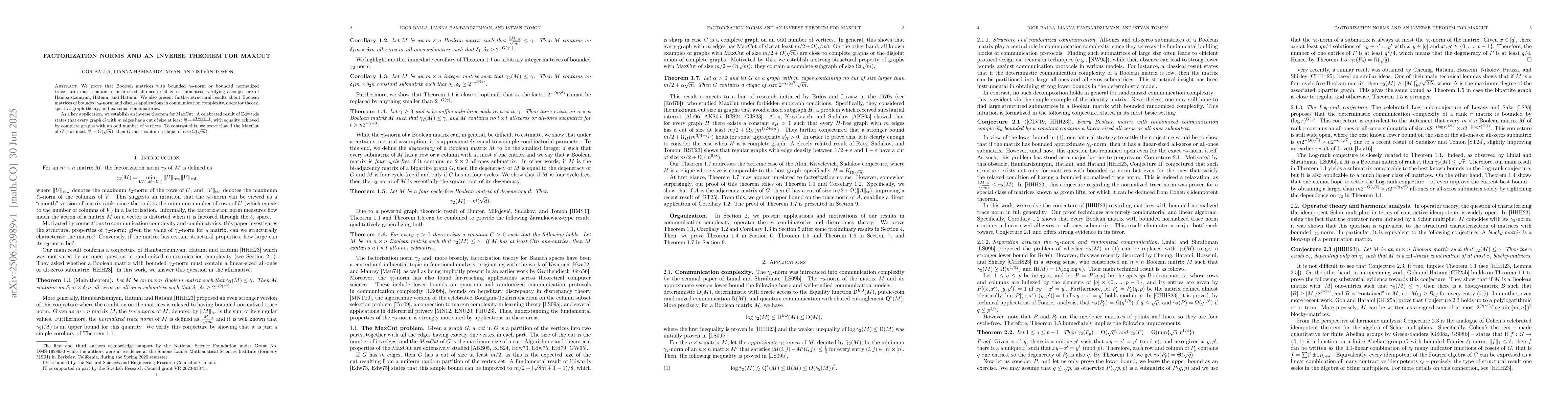 We prove that Boolean matrices with bounded $\gamma_2$-norm or bounded normalized trace norm must contain a linear-sized all-ones or all-zeros submatrix, verifying a conjecture of Hambardzumyan, Hatami, and Hatami. We also present further structural results about Boolean matrices of bounded $\gamma_2$-norm and discuss applications in communication complexity, operator theory, spectral graph theory, and extremal combinatorics. As a key application, we establish an inverse theorem for MaxCut. A celebrated result of Edwards states that every graph $G$ with $m$ edges has a cut of size at least $\frac{m}{2}+\frac{\sqrt{8m+1}-1}{8}$, with equality achieved by complete graphs with an odd number of vertices. To contrast this, we prove that if the MaxCut of $G$ is at most $\frac{m}{2}+O(\sqrt{m})$, then $G$ must contain a clique of size $\Omega(\sqrt{m})$.