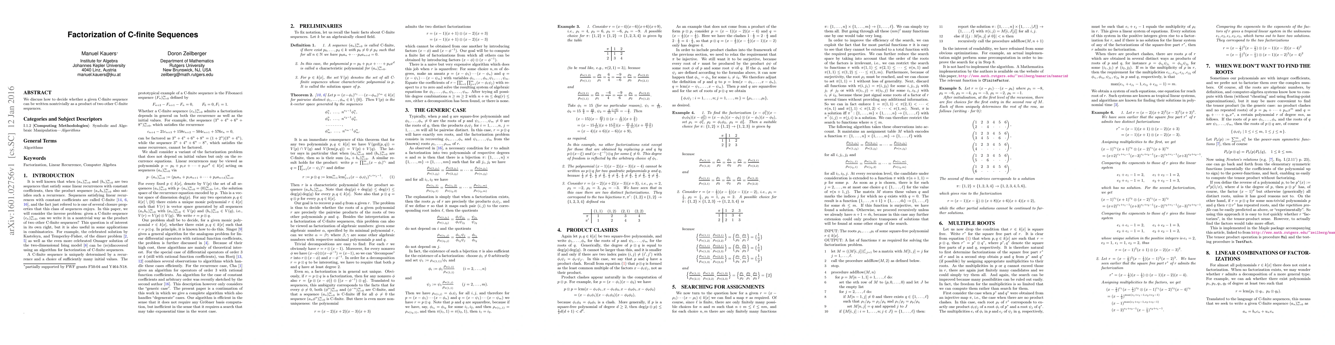 Summary: This paper explores the factorization of C-finite sequences, focusing on determining if a given sequence can be nontrivially expressed as a product of two other C-finite sequences. The method provides a framework for such factorization decisions.