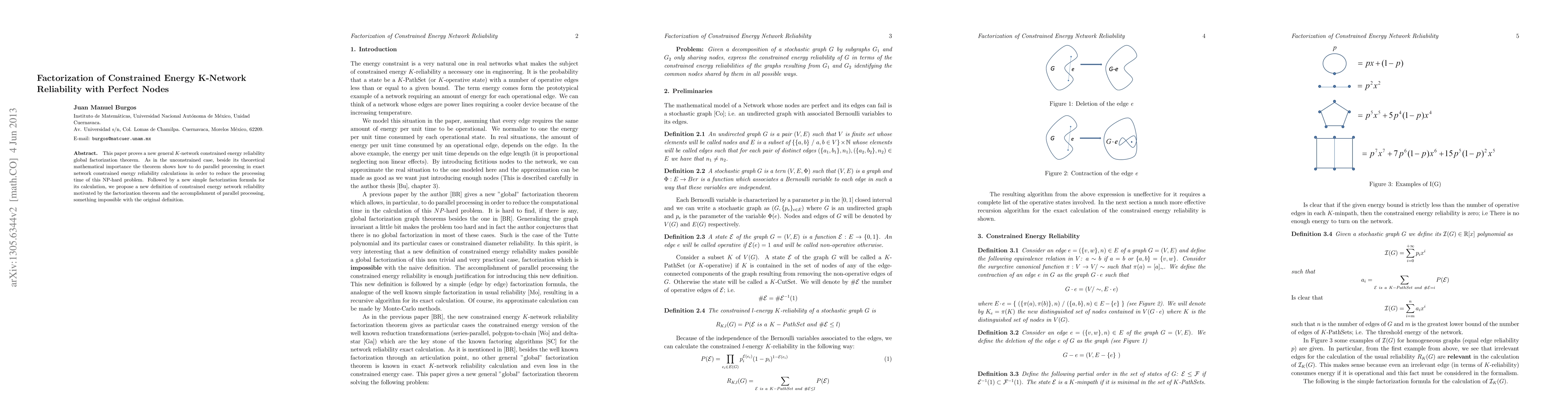This paper proves a new general K-network constrained energy reliability global factorization theorem. As in the unconstrained case, beside its theoretical mathematical importance the theorem shows how to do parallel processing in exact network constrained energy reliability calculations in order to reduce the processing time of this NP-hard problem. Followed by a new simple factorization formula for its calculation, we propose a new definition of constrained energy network reliability motivated by the factorization theorem and the accomplishment of parallel processing, something impossible with the original definition.