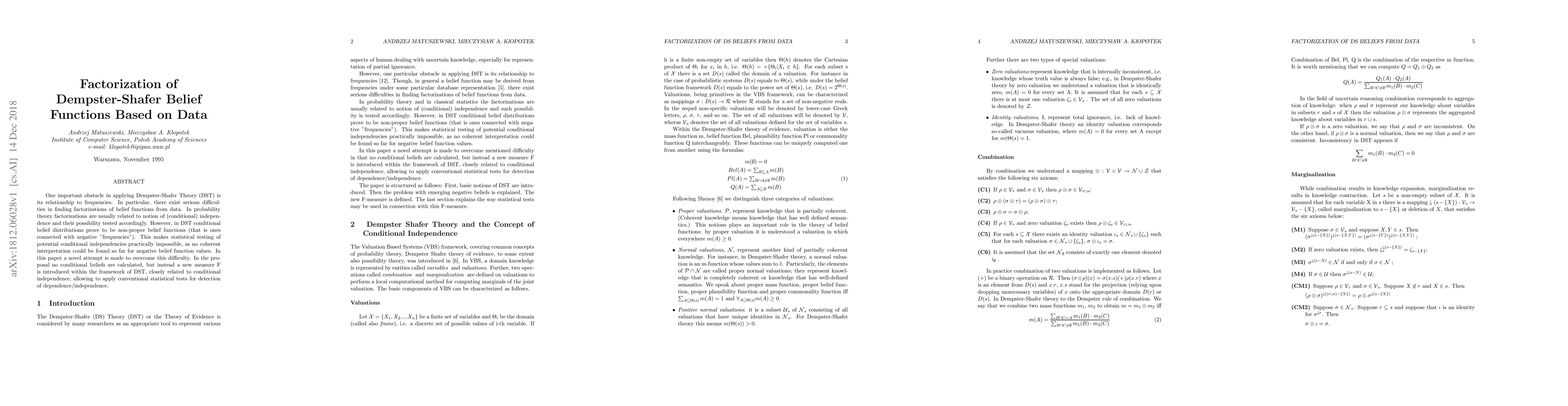This paper proposes a novel method to factorize Dempster-Shafer belief functions from data, addressing the challenge of negative "frequencies" in conditional belief distributions. It introduces a new measure F within DST to facilitate the application of conventional statistical tests for detecting dependence/independence.