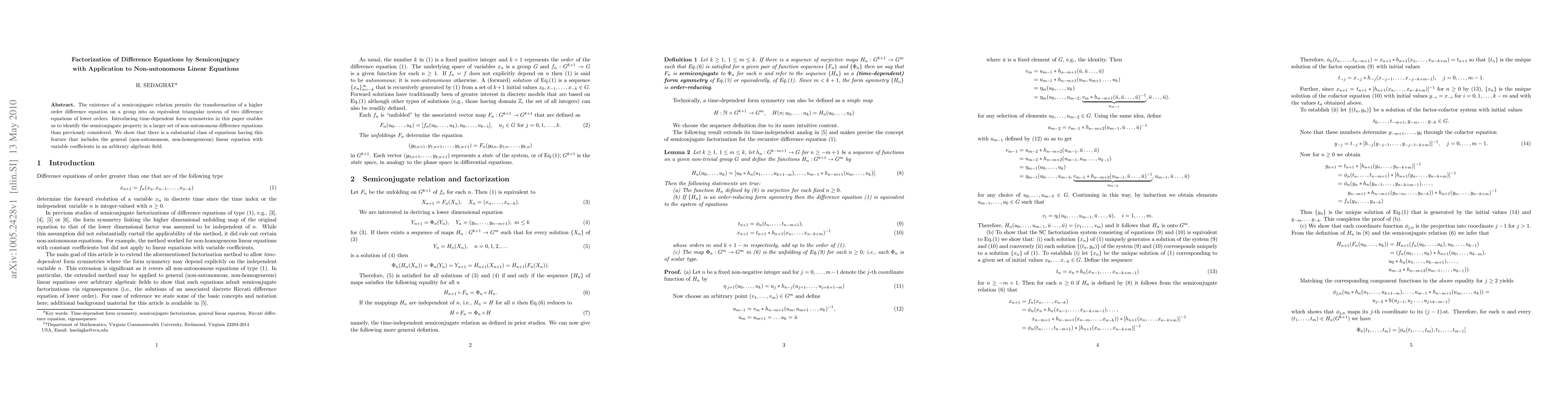 This paper explores the factorization of higher-order difference equations into a system of lower-order equations via semiconjugacy, extending the method to a broader class of non-autonomous linear equations by incorporating time-dependent symmetries. It demonstrates the applicability to general non-autonomous, non-homogeneous linear equations with variable coefficients.