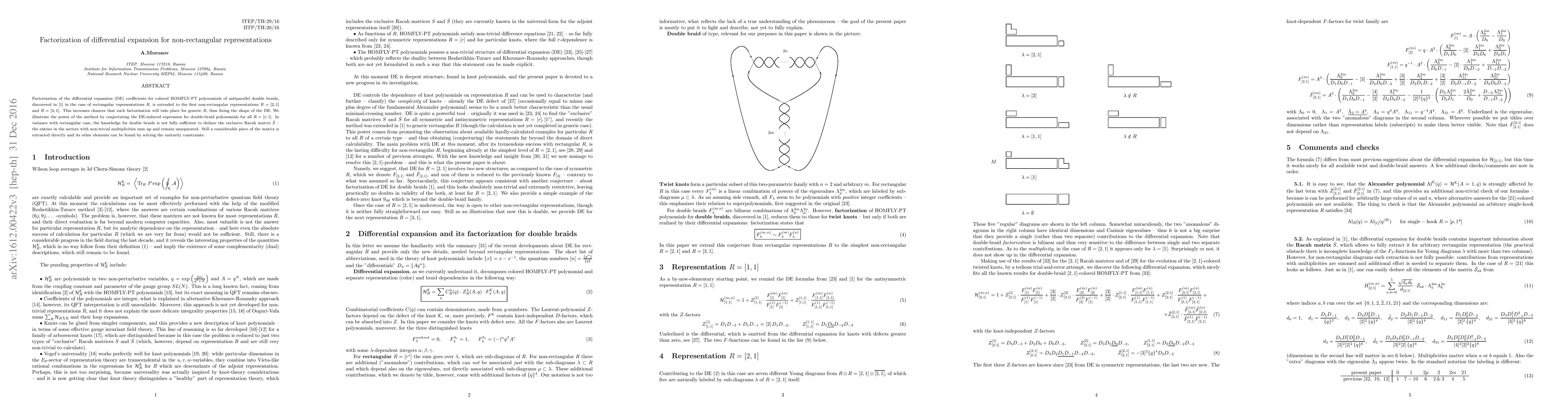 Factorization of the differential expansion coefficients for HOMFLY-PT polynomials of double braids, discovered in arXiv:1606.06015 in the case of rectangular representations $R$, is extended to the first non-rectangular representations $R=[2,1]$ and $R=[3,1]$. This increases chances that such factorization will take place for generic $R$, thus fixing the shape of the DE. We illustrate the power of the method by conjecturing the DE-induced expression for double-braid polynomials for all $R=[r,1]$. In variance with rectangular case, the knowledge for double braids is not fully sufficient to deduce the exclusive Racah matrix $\bar S$ -- the entries in the sectors with non-trivial multiplicities sum up and remain unseparated. Still a considerable piece of the matrix is extracted directly and its other elements can be found by solving the unitarity constraints.