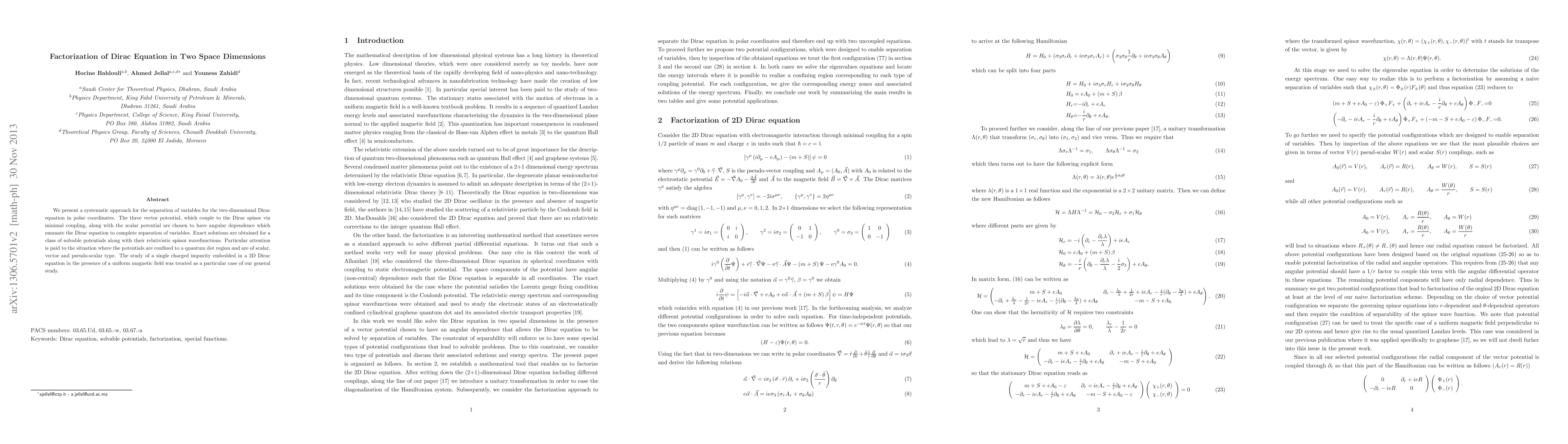 We present a systematic approach for the separation of variables for the two-dimensional Dirac equation in polar coordinates. The three vector potential, which couple to the Dirac spinor via minimal coupling, along with the scalar potential are chosen to have angular dependence which emanate the Dirac equation to complete separation of variables. Exact solutions are obtained for a class of solvable potentials along with their relativistic spinor wavefunctions. Particular attention is paid to the situation where the potentials are confined to a quantum dot region and are of scalar, vector and pseudo-scalar type. The study of a single charged impurity embedded in a 2D Dirac equation in the presence of a uniform magnetic field was treated as a particular case of our general study.