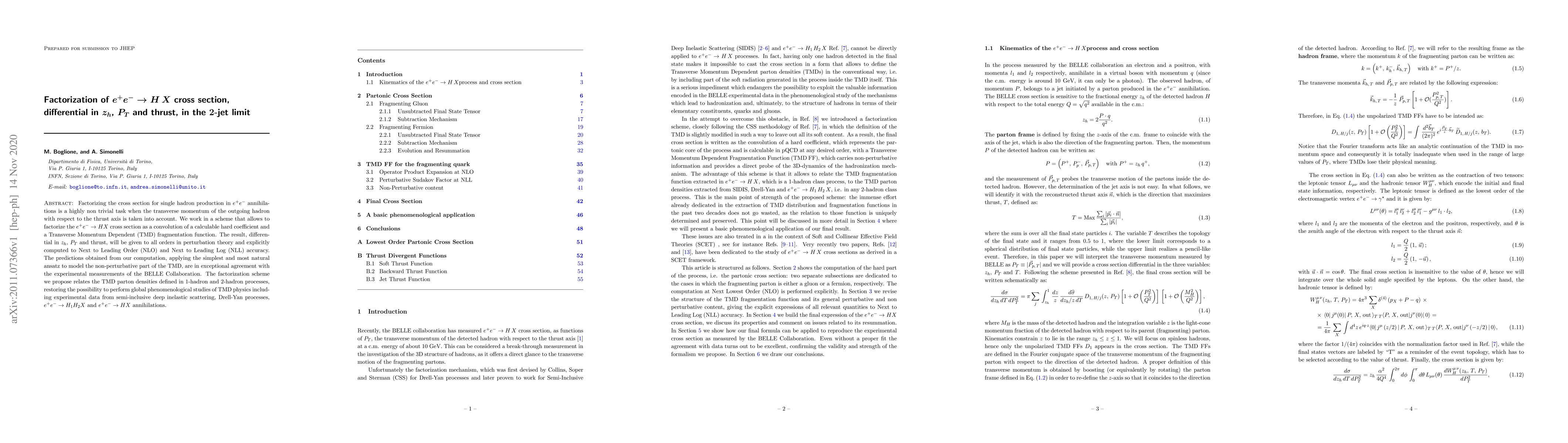 This paper presents a factorization scheme for the $e^+e^- \to H \, X$ cross section, factorizing it into a calculable hard coefficient and a Transverse Momentum Dependent (TMD) fragmentation function. The results are computed to NLO and NLL accuracy, showing excellent agreement with BELLE experimental data.