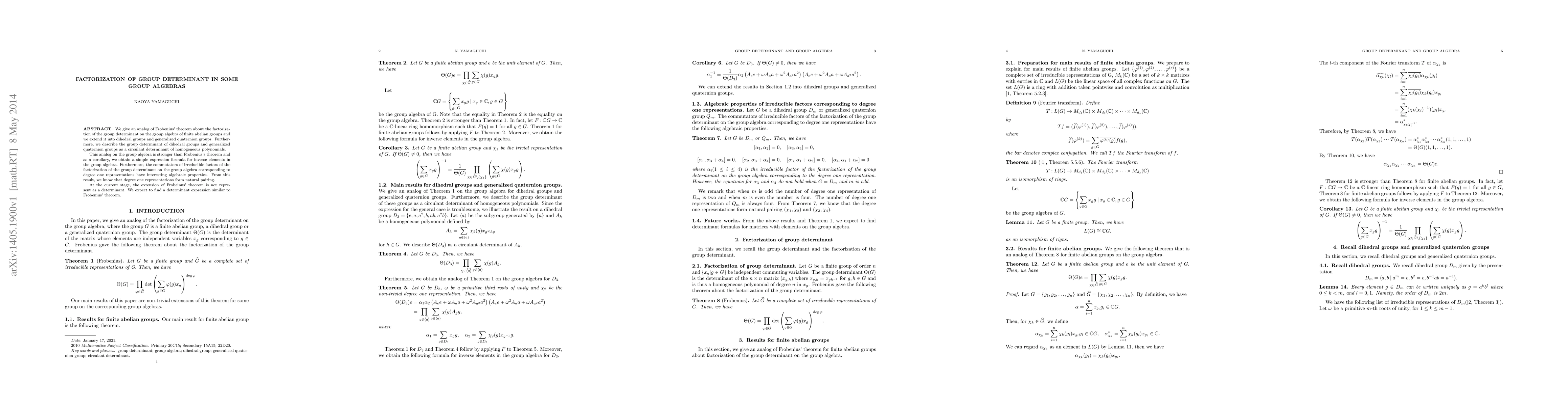 We give an analog of Frobenius' theorem about the factorization of the group determinant on the group algebra of finite abelian groups and we extend it into dihedral groups and generalized quaternion groups. Furthermore, we describe the group determinant of dihedral groups and generalized quaternion groups as a circulant determinant of homogeneous polynomials. This analog on the group algebra is stronger than Frobenius's theorem and as a corollary, we obtain a simple expression formula for inverse elements in the group algebra. Furthermore, the commutators of irreducible factors of the factorization of the group determinant on the group algebra corresponding to degree one representations have interesting algebraic properties. From this result, we know that degree one representations form natural pairing. At the current stage, the extension of Frobeinus' theorem is not represent as a determinant. We expect to find a determinant expression similar to Frobenius' theorem.