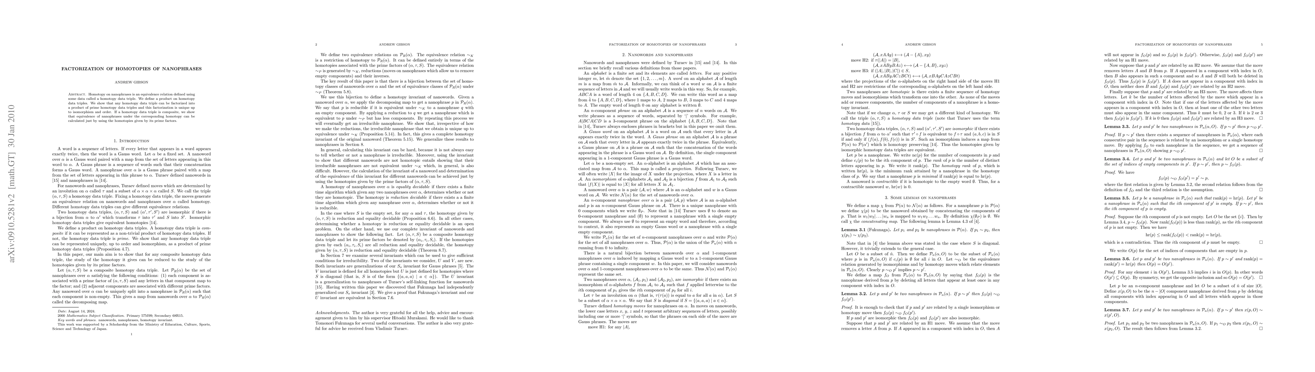 Homotopy on nanophrases is an equivalence relation defined using some data called a homotopy data triple. We define a product on homotopy data triples. We show that any homotopy data triple can be factorized into a product of prime homotopy data triples and this factorization is unique up to isomorphism and order. If a homotopy data triple is composite, we show that equivalence of nanophrases under the corresponding homotopy can be calculated just by using the homotopies given by its prime factors.