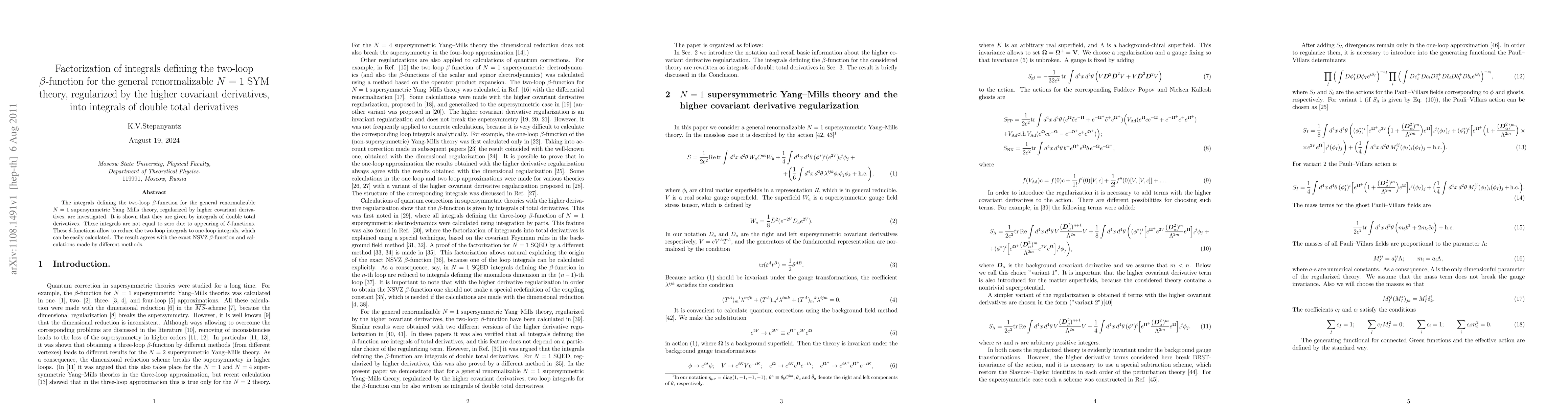 This paper investigates the factorization of two-loop beta-function integrals in N=1 supersymmetric Yang-Mills theory, demonstrating they can be expressed as integrals of double total derivatives. The presence of delta-functions enables the reduction of these complex integrals to simpler one-loop integrals, which yield results consistent with existing NSVZ beta-function calculations.
