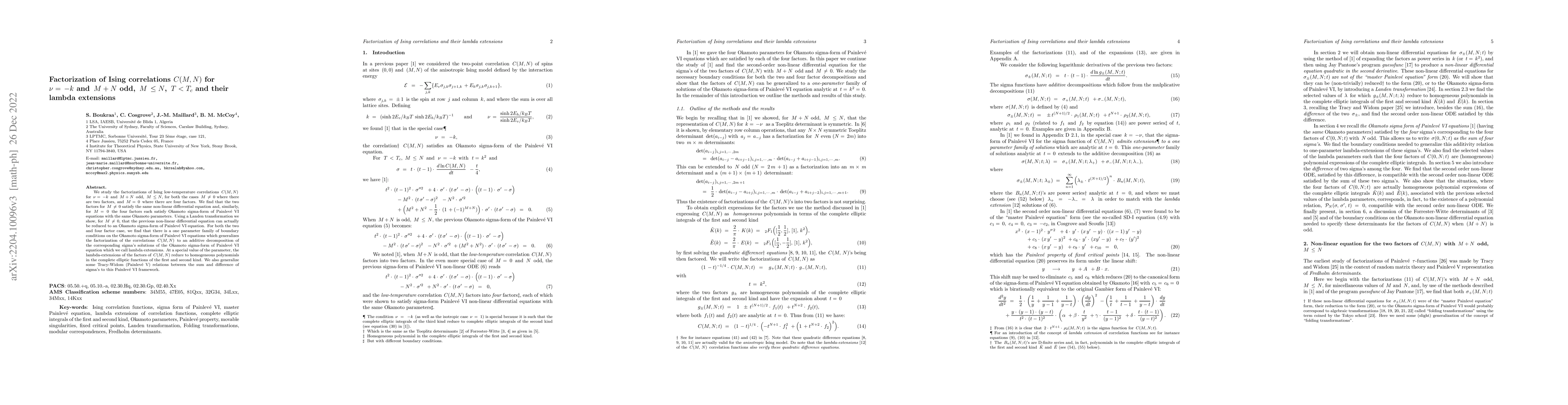 This paper investigates the factorization of Ising correlations C(M,N) at low temperatures for $\nu=-k$ and odd M+N, revealing two factors for $M \neq 0$ and four for $M=0$. It shows that these factors satisfy specific Painlevé VI equations, and through a Landen transformation, reduces the non-linear differential equation to a Painlevé VI form. The study also introduces lambda extensions, which generalize the factorization to sigma solutions, and relates these findings to Tracy-Widom relations.