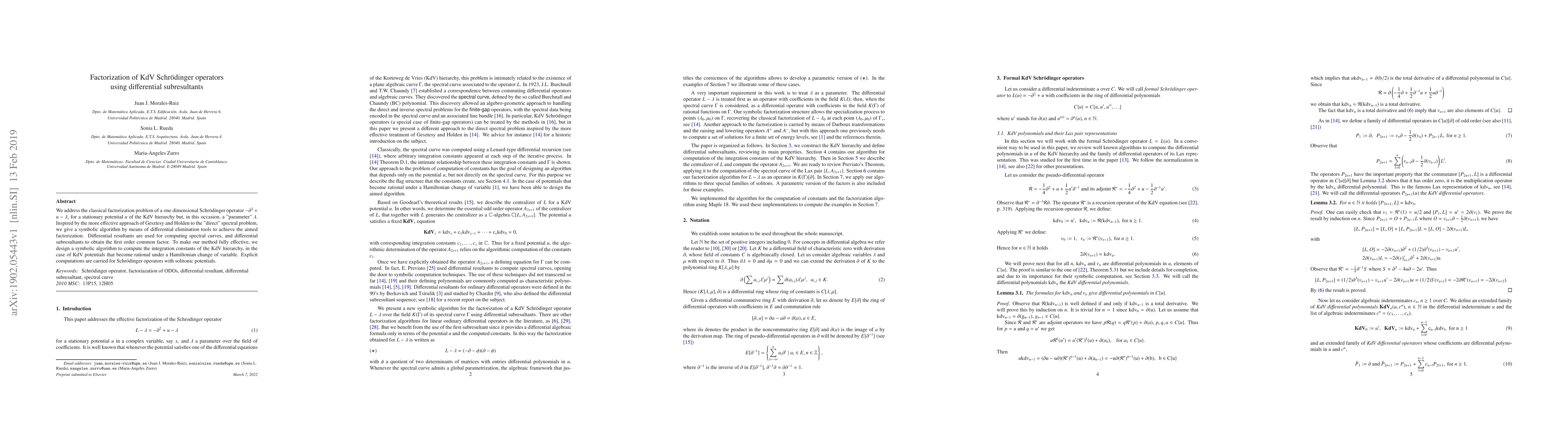 We address the classical factorization problem of a one dimensional Schr\"odinger operator $-\partial^2+u-\lambda$, for a stationary potential $u$ of the KdV hierarchy but, in this occasion, a "parameter" $\lambda$. Inspired by the more effective approach of Gesztesy and Holden to the "direct" spectral problem, we give a symbolic algorithm by means of differential elimination tools to achieve the aimed factorization. Differential resultants are used for computing spectral curves, and differential subresultants to obtain the first order common factor. To make our method fully effective, we design a symbolic algorithm to compute the integration constants of the KdV hierarchy, in the case of KdV potentials that become rational under a Hamiltonian change of variable. Explicit computations are carried for Schr\"odinger operators with solitonic potentials.