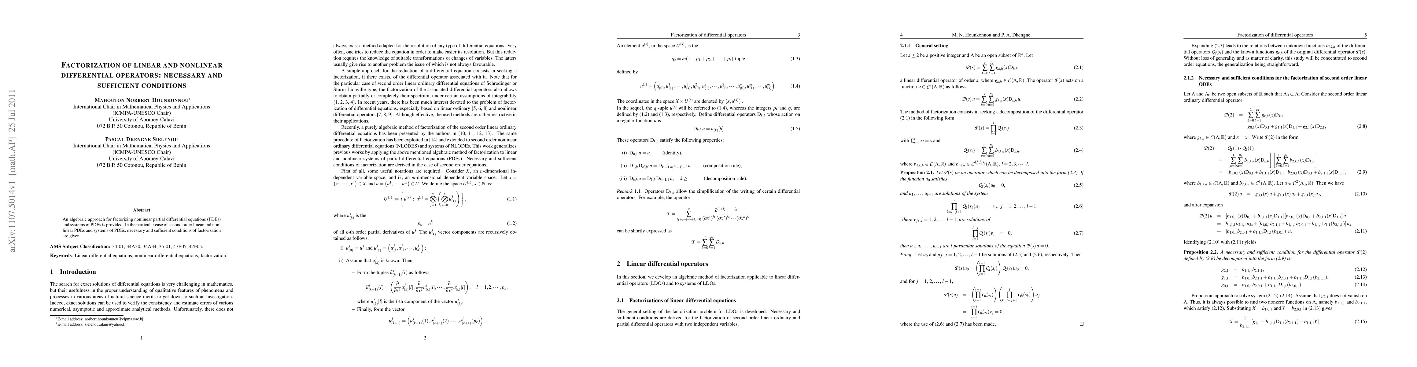 This paper proposes an algebraic method for factorizing nonlinear partial differential equations (PDEs) and systems of PDEs, providing necessary and sufficient conditions for factorization specifically for second-order linear and nonlinear PDEs.