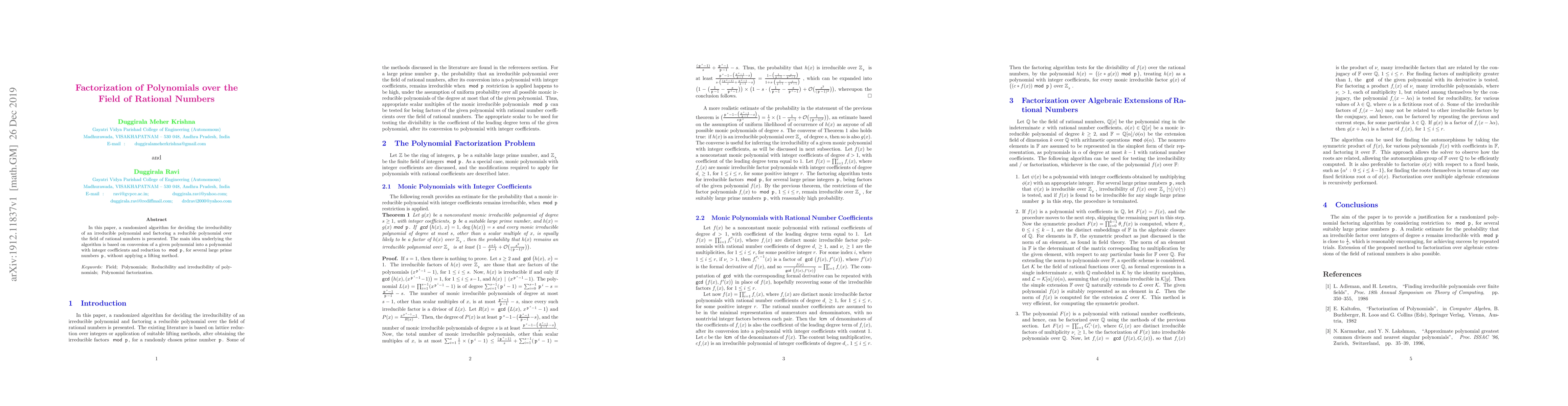 This paper introduces a randomized algorithm for determining the irreducibility of polynomials and factoring reducible ones over rational numbers, relying on converting polynomials to integer coefficients and reducing modulo large primes without lifting.