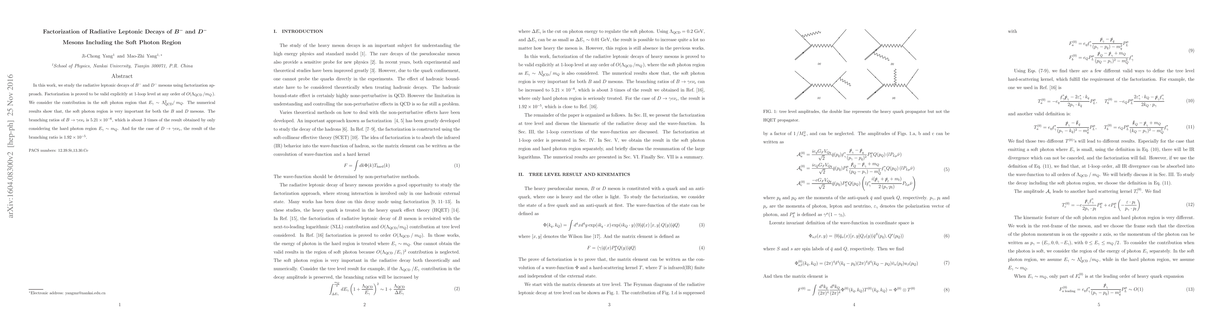 This paper investigates the radiative leptonic decays of $B^-$ and $D^-$ mesons using a factorization approach, demonstrating its validity at the 1-loop level. The study highlights the significant contribution of the soft photon region, leading to branching ratios of $5.21\times 10^{-6}$ for $B\to \gamma e\nu_e$ and $1.92\times 10^{-5}$ for $D\to \gamma e\nu_e$, emphasizing the importance of this region.