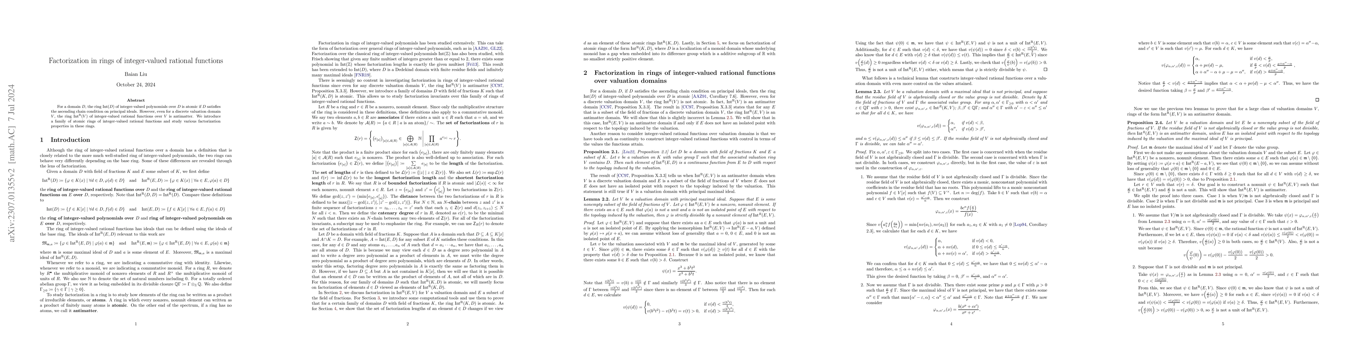 This paper explores the factorization properties of the ring $\IntR(V)$ of integer-valued rational functions over a discrete valuation domain $V$, revealing that it is antimatter. The authors introduce a new family of atomic rings of integer-valued rational functions and investigate their factorization characteristics.