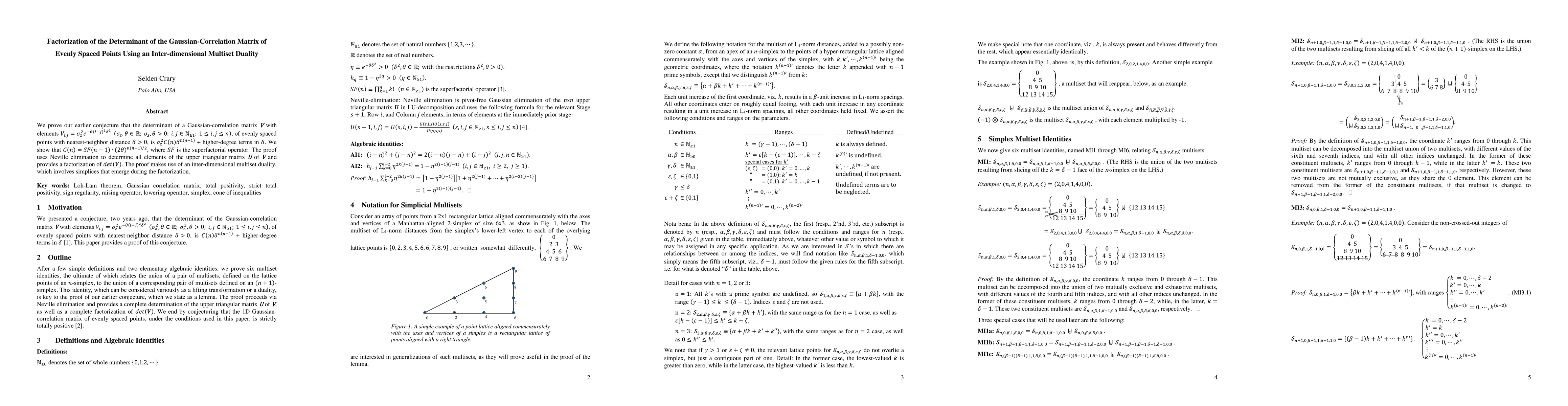 We prove that the determinant of a Gaussian-correlation matrix V of n evenly spaced points has leading power n(n-1) in the nearest-neighbor distance between points. The proof uses Neville elimination to determine all elements of the upper triangular matrix U of V and provides a factorization of det(V). The proof makes use of an inter-dimensional multiset duality involving simplices that emerge during the factorization. We conjecture that V for evenly spaced points is strictly totally positive.