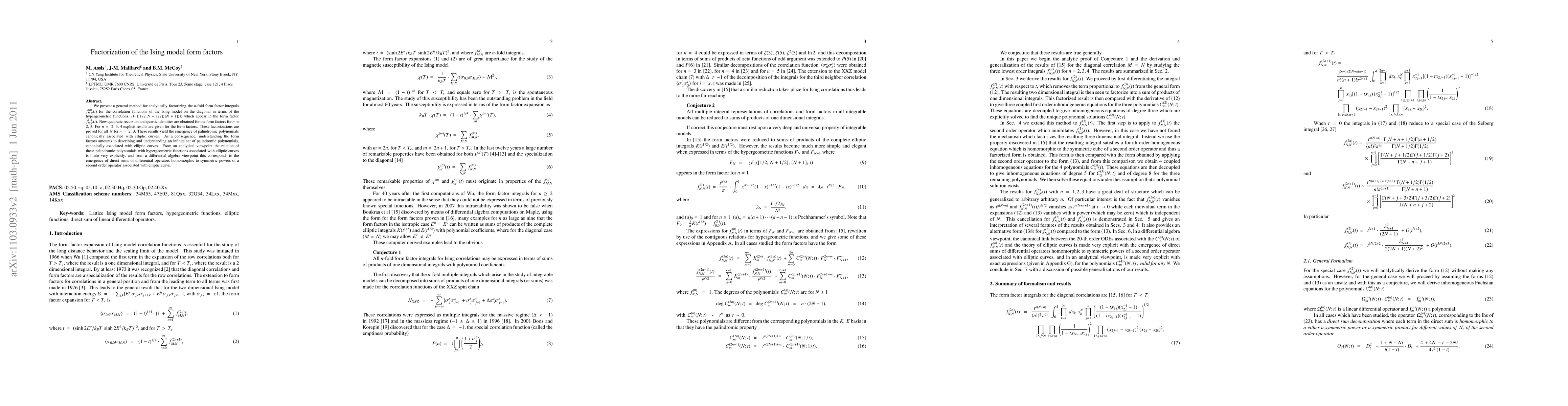 This paper introduces a method to factorize n-fold form factor integrals of the Ising model, expressing them in terms of hypergeometric functions. The study reveals new quadratic and quartic identities for form factors and explicitly provides results for n=2,3,4, linking these to palindromic polynomials associated with elliptic curves.