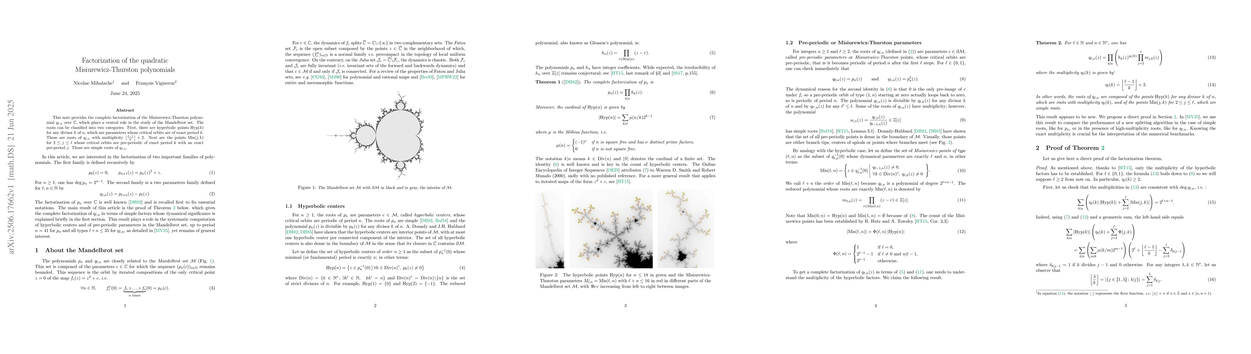This note provides the complete factorization of the Misiurewicz-Thurston polynomial $q_{\ell,n}=p_{\ell+n}(z) - p_\ell(z)$ over $\mathbb{C}$, which plays a central role in the study of the Mandelbrot set, where \[ p_0(z) = 0, \qquad p_{n+1}(z) = p_n(z)^2 + z. \] The roots can be classified into two categories. First, there are hyperbolic points $\operatorname{hyp}(k)$ for any divisor $k$ of $n$, which are parameters whose critical orbits are of exact period $k$. Those are roots of $q_{\ell,n}$ with multiplicity $\left\lfloor \frac{\ell -1}{k} \right\rfloor + 2$. Next are the points $\operatorname{mis}(j,k)$ for $2\leq j\leq \ell$ whose critical orbits are pre-periodic of exact period $k$ with an exact pre-period $j$. Those are simple roots of $q_{\ell,n}$.