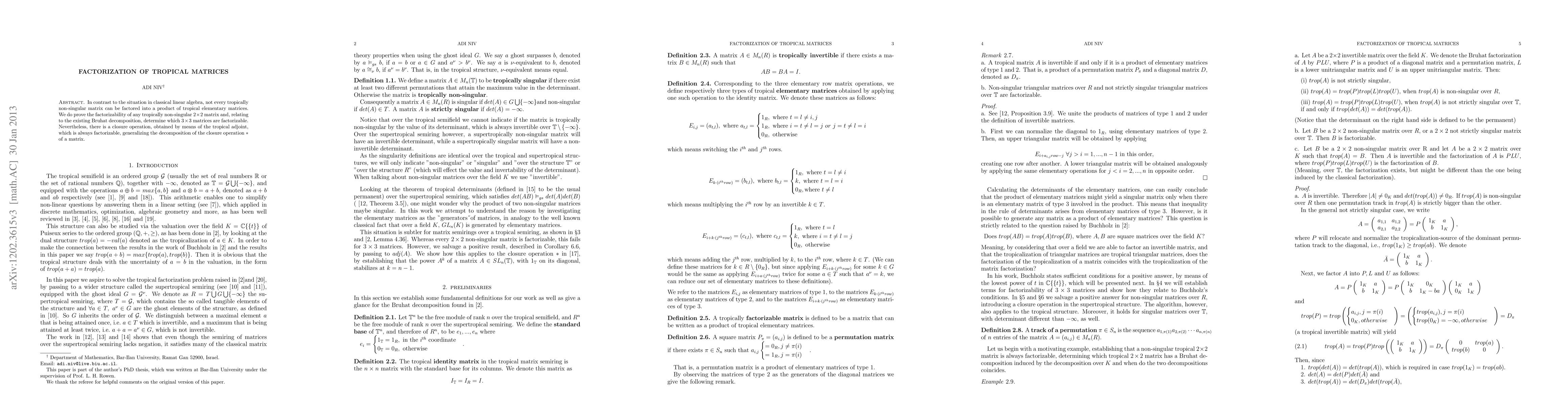 In contrast to the situation in classical linear algebra, not every tropically non-singular matrix can be factored into a product of tropical elementary matrices. We do prove the factorizability of any tropically non-singular 2x2 matrix and, relating to the existing Bruhat decomposition, determine which 3x3 matrices are factorizable. Nevertheless, there is a closure operation, obtained by means of the tropical adjoint, which is always factorizable, generalizing the decomposition of the closure operation * of a matrix.