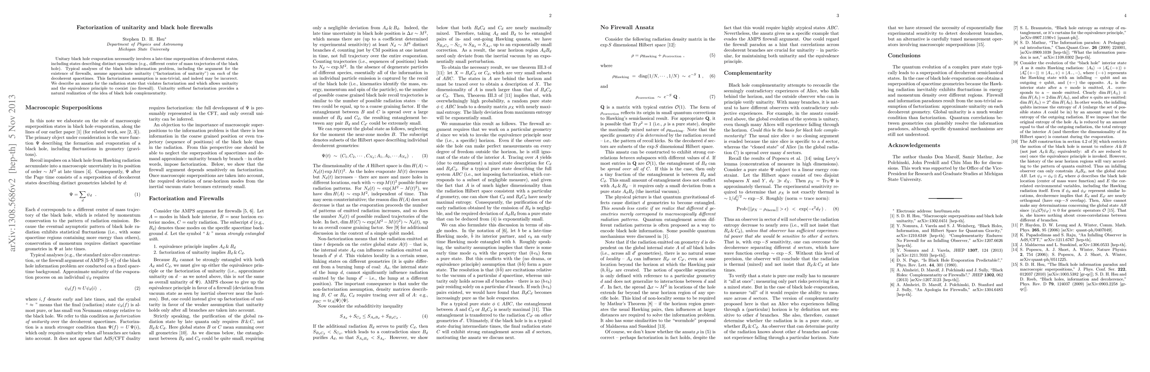 Unitary black hole evaporation necessarily involves a late-time superposition of decoherent states, including states describing distinct spacetimes (e.g., different center of mass trajectories of the black hole). Typical analyses of the black hole information problem, including the argument for the existence of firewalls, assume approximate unitarity ("factorization of unitarity") on each of the decoherent spacetimes. This factorization assumption is non-trivial, and indeed may be incorrect. We describe an ansatz for the radiation state that violates factorization and which allows unitarity and the equivalence principle to coexist (no firewall). Unitarity without factorization provides a natural realization of the idea of black hole complementarity.