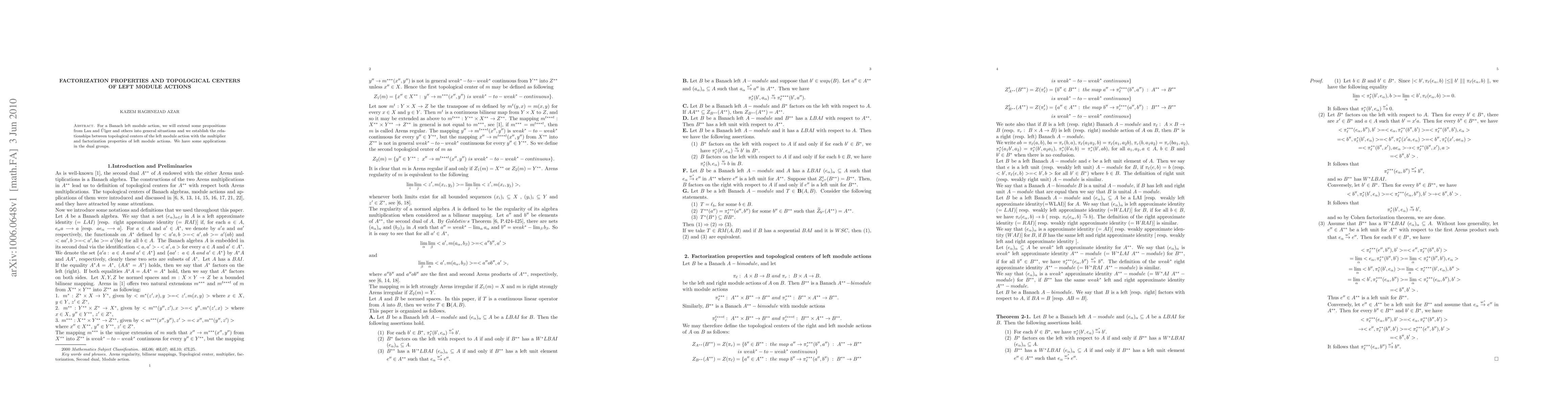 This paper extends propositions on Banach left module actions, establishing connections between topological centers and factorization properties, with applications to dual groups. It investigates the relationships between these properties and the multiplier of the module actions.