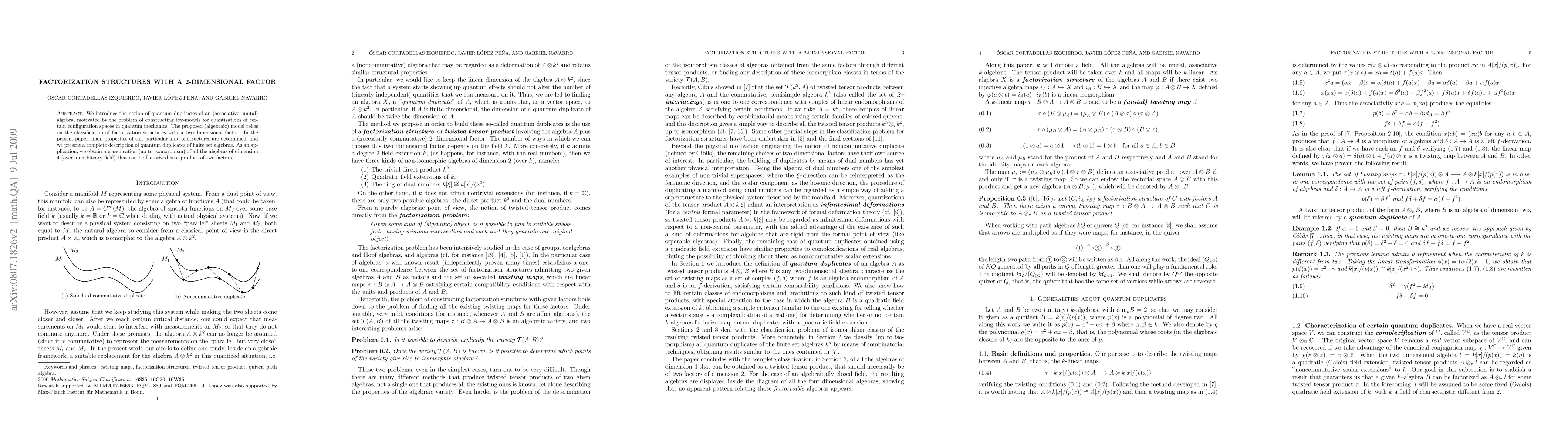 We introduce the notion of quantum duplicates of an (associative, unital) algebra, motivated by the problem of constructing toy-models for quantizations of certain configuration spaces in quantum mechanics. The proposed (algebraic) model relies on the classification of factorization structures with a two-dimensional factor. In the present paper, main properties of this particular kind of structures are determined, and we present a complete description of quantum duplicates of finite set algebras. As an application, we obtain a classification (up to isomorphism) of all the algebras of dimension 4 (over an arbitrary field) that can be factorized as a product of two factors.