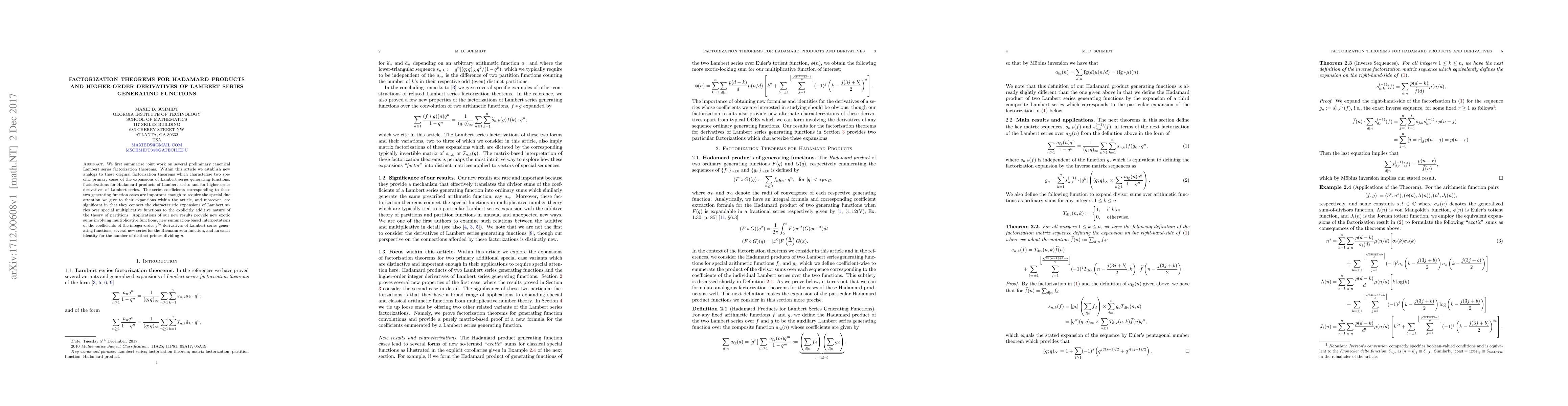 This paper establishes new factorization theorems for Hadamard products and higher-order derivatives of Lambert series generating functions, providing significant expansions and connections to the theory of partitions and applications including new sums and series for the Riemann zeta function.
