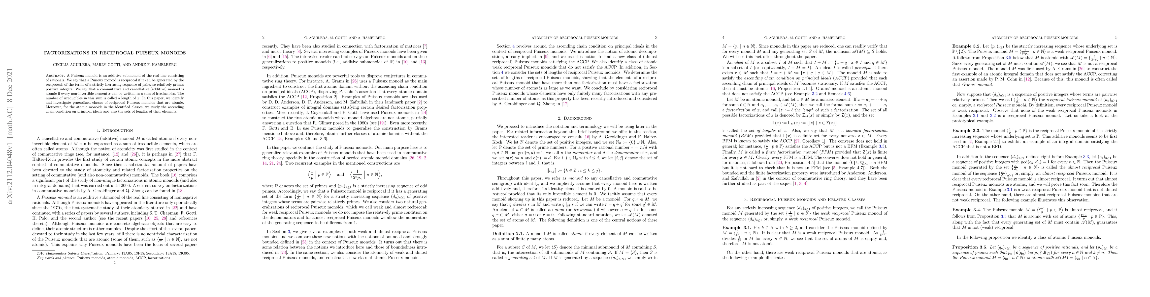 A Puiseux monoid is an additive submonoid of the real line consisting of rationals. We say that a Puiseux monoid is reciprocal if it can be generated by the reciprocals of the terms of a strictly increasing sequence of pairwise relatively primes positive integers. We say that a commutative and cancellative (additive) monoid is atomic if every non-invertible element $x$ can be written as a sum of irreducibles. The number of irreducibles in this sum is called a length of $x$. In this paper, we identify and investigate generalized classes of reciprocal Puiseux monoids that are atomic. Moreover, for the atomic monoids in the identified classes, we study the ascending chain condition on principal ideals and also the sets of lengths of their elements.