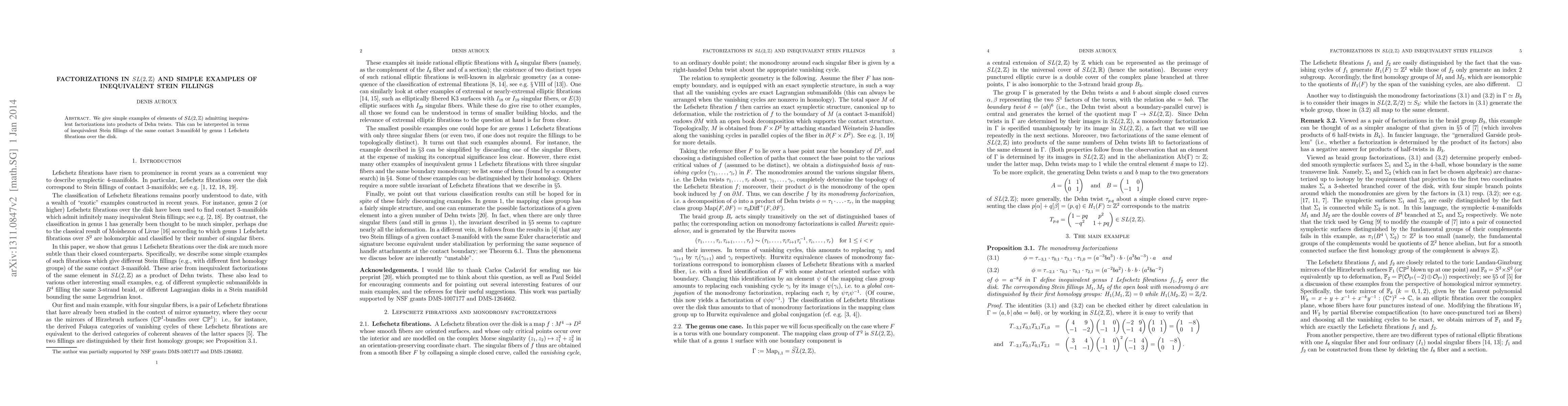 Summary: The paper presents examples of SL(2,Z) elements with distinct factorizations into Dehn twists, illustrating inequivalent Stein fillings of a contact 3-manifold via genus 1 Lefschetz fibrations over the disk.