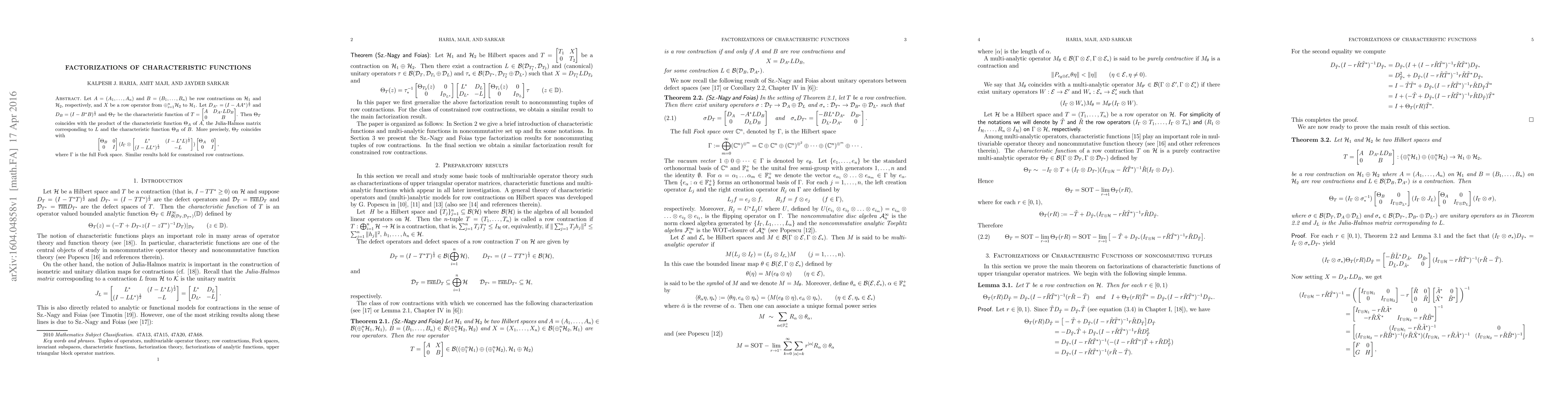 Let $A = (A_1, \ldots, A_n)$ and $B = (B_1, \ldots, B_n)$ be row contractions on $\mathcal{H}_1$ and $\mathcal{H}_2$, respectively, and $X$ be a row operator from $\oplus_{i=1}^n \mathcal{H}_2$ to $\mathcal{H}_1$. Let $D_{A^*} = (I - A A^*)^{\frac{1}{2}}$ and $D_{B} = (I - B^* B)^{\frac{1}{2}}$ and $\Theta_T$ be the characteristic function of $T = \begin{bmatrix} A& D_{A^*}L D_B\\ 0 & B \end{bmatrix}$. Then $\Theta_T$ coincides with the product of the characteristic function $\Theta_A$ of $A$, the Julia-Halmos matrix corresponding to $L$ and the characteristic function $\Theta_B$ of $B$. More precisely, $\Theta_T$ coincides with \[ \begin{bmatrix} \Theta_B & 0 \\ 0 & I \end{bmatrix} (I_\Gamma \otimes \begin{bmatrix} L^* & (I - L^* L)^{\frac{1}{2}} \\ (I - L L^*)^{\frac{1}{2}} & - L \end{bmatrix}) \begin{bmatrix} \Theta_A & 0\\ 0& I\end{bmatrix}, \] where $\Gamma$ is the full Fock space. Similar results hold for constrained row contractions.