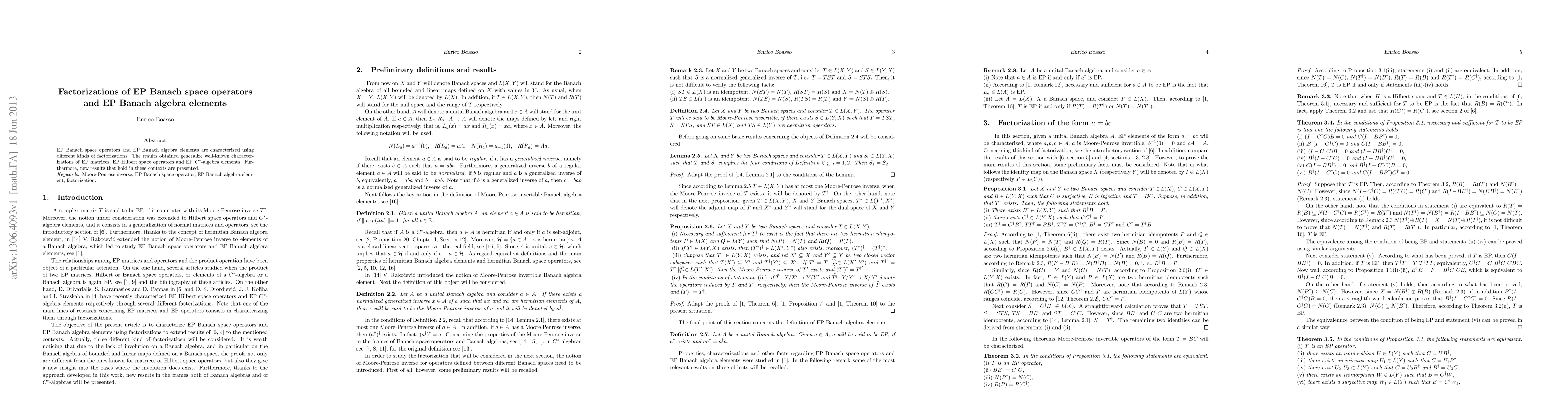 EP Banach space operators and EP Banach algebra elements are characterized using different kinds of factorizations. The results obtained generalize well-known characterizations of EP matrices, EP Hilbert space operators and EP $C^*$-algebra elements. Furthermore, new results that hold in these contexts are presented.