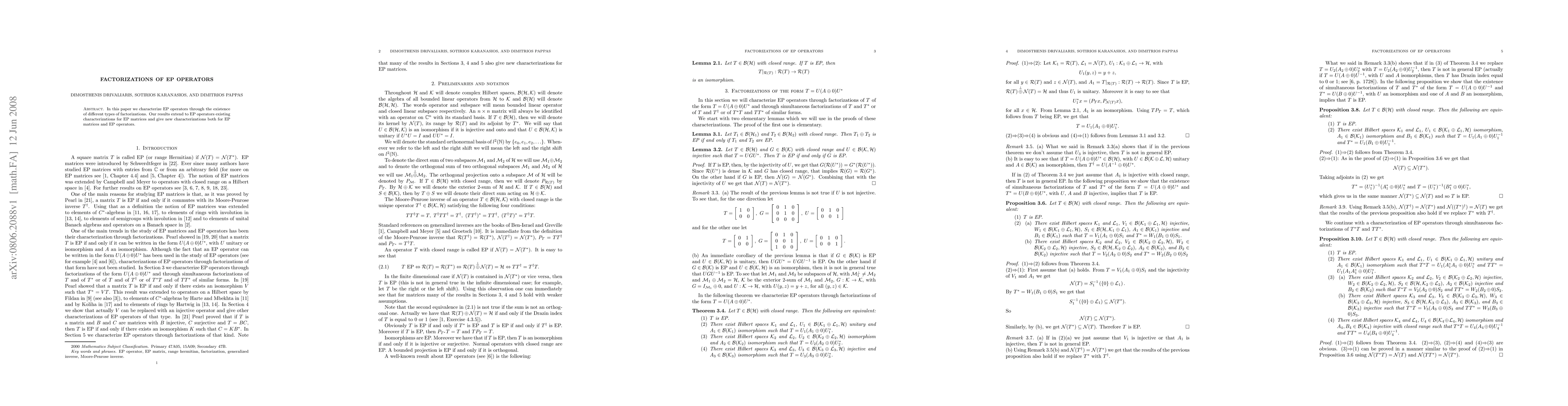 This paper characterizes EP operators via various factorization types, extending existing characterizations for EP matrices and introducing new characterizations for both EP matrices and EP operators.