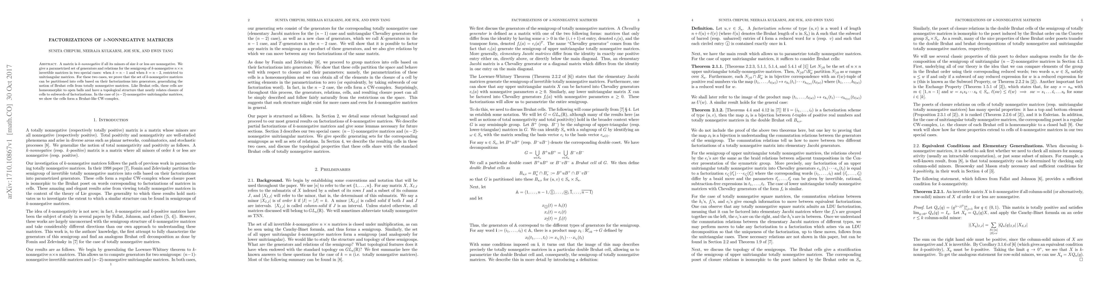 This paper presents a set of generators and relations for semigroups of $k$-nonnegative invertible matrices, particularly focusing on $k = n-1$ and $k = n-2$ for unitriangular matrices. It demonstrates a partitioning of these matrices into cells based on their factorizations, analogous to Bruhat cells, revealing a topological structure that connects cell closures to factorization subwords.